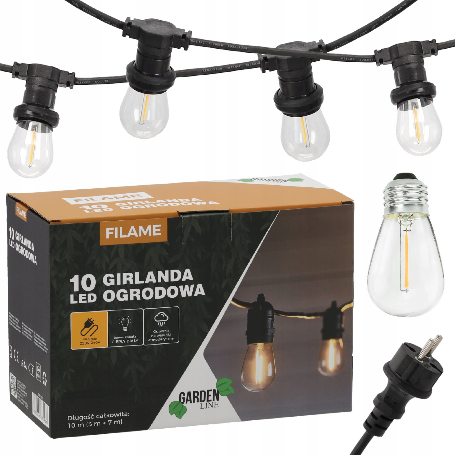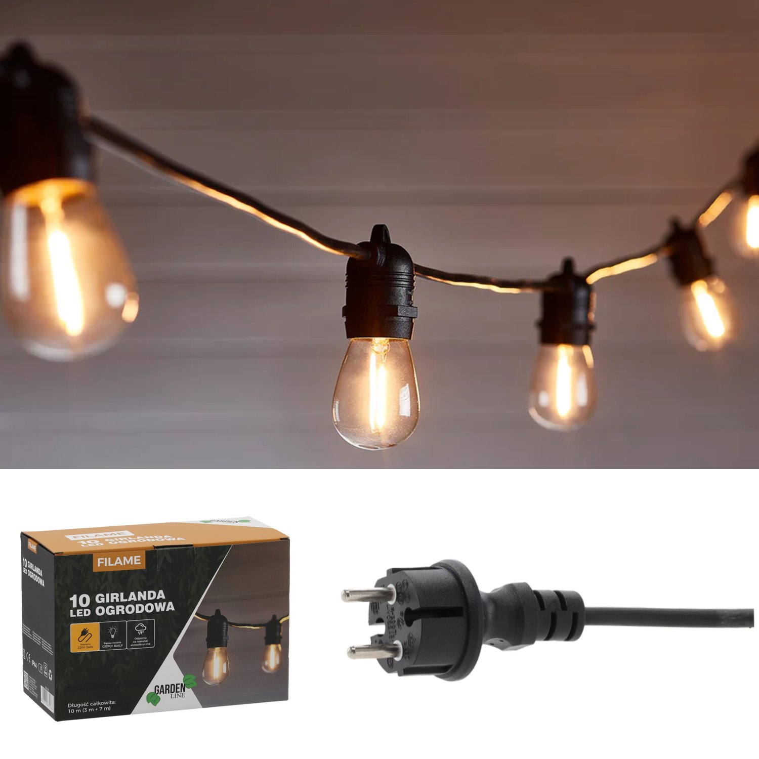Vrtna girlanda 3+7 m filame 10 LED – Chomik nudi savršenu kombinaciju estetike, učinkovitosti i izdržljivosti. Njome možete svoj vanjski prostor pretvoriti u ugodno osvijetljen kutak koji poziva na opuštanje i druženje. Bez obzira radi li se o privatnoj terasi, ugostiteljskom vrtu ili sezonskom događaju, ova girlanda će se pobrinuti za čarobnu svjetlost koja spaja funkcionalnost s estetskom savršenošću. Proizvedena u tvornici Chomik u Poljskoj, predstavlja pouzdan proizvod namijenjen dugotrajnoj upotrebi i svakodnevnom uživanju u ugodnoj svjetlosti.