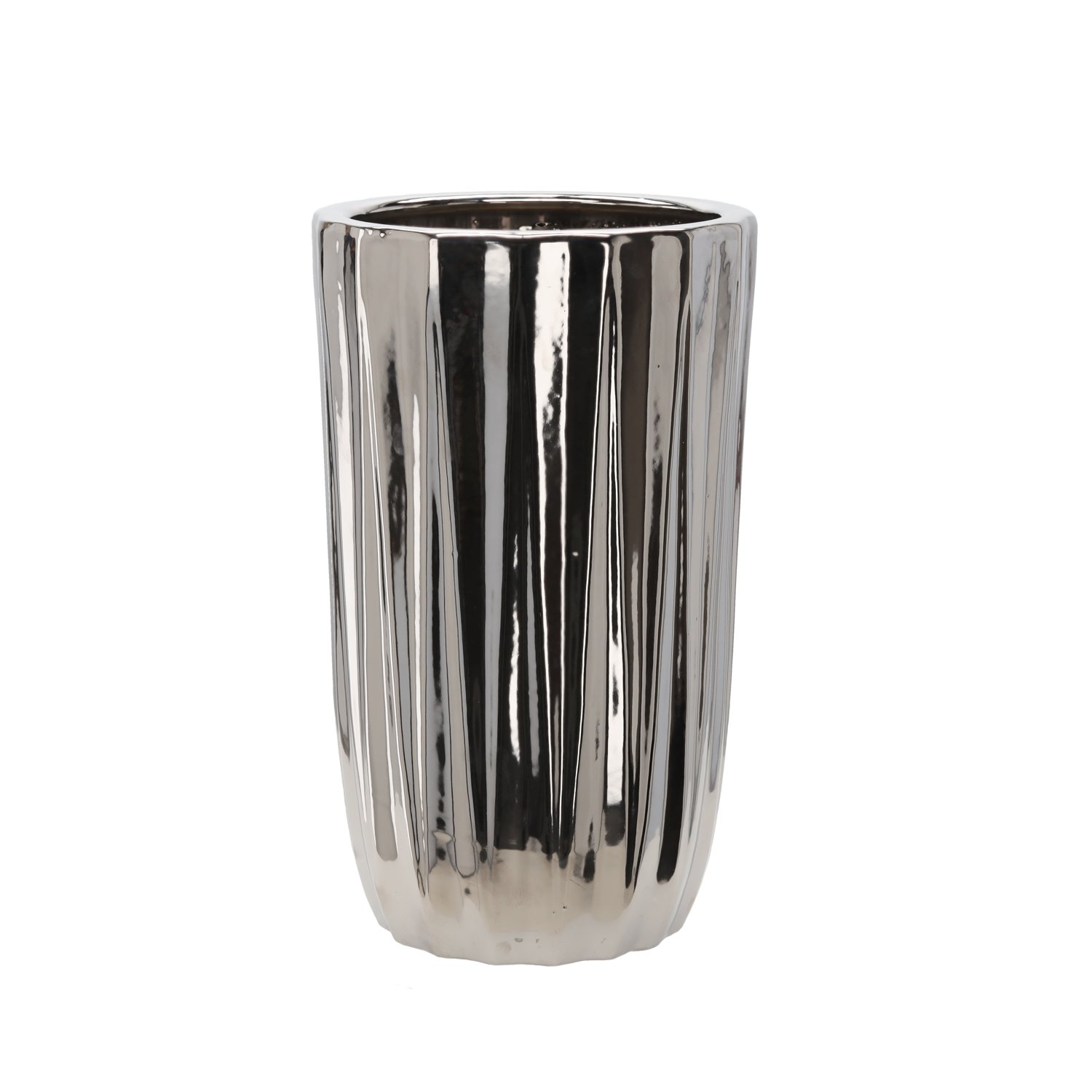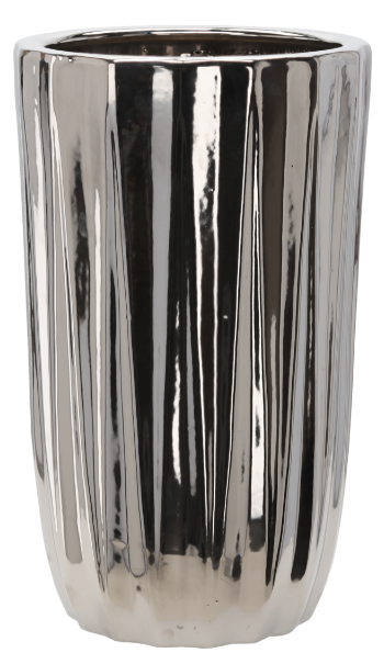 Posuda je izrađena od izdržljive keramike koja osigurava stabilnost i otpornost na svakodnevnu upotrebu. Srebrna boja s visokim sjajem stvara dojam luksuza, stoga je prikladna za elegantne stambene prostore, hotelske predvorja ili urede, gdje je važan svaki detalj dojma. Rebrasta struktura površine nije samo estetski element – razigrava oblik i omogućuje zanimljivo lomljenje svjetlosti, stvarajući suptilne odsjaje koji prostoru dodaju dinamiku i dubinu.
