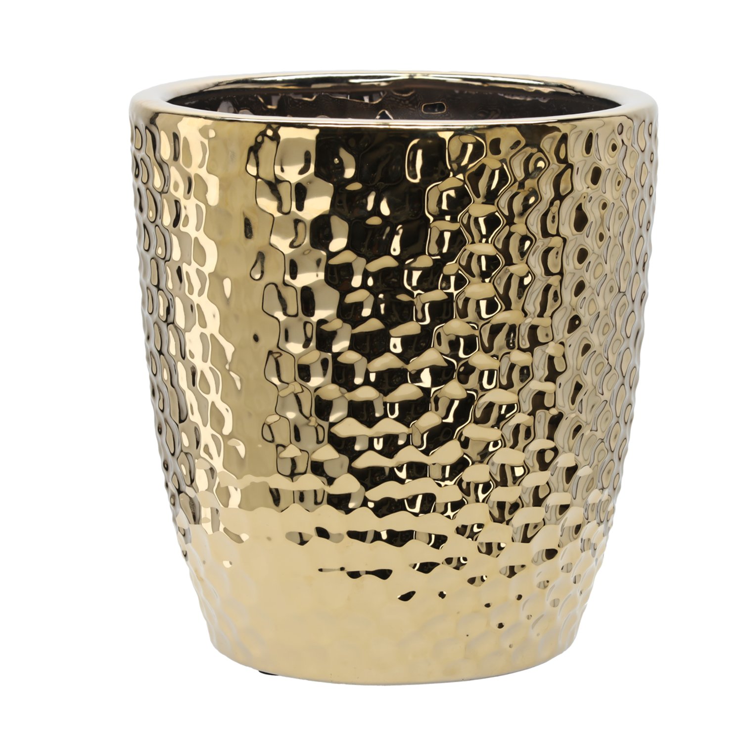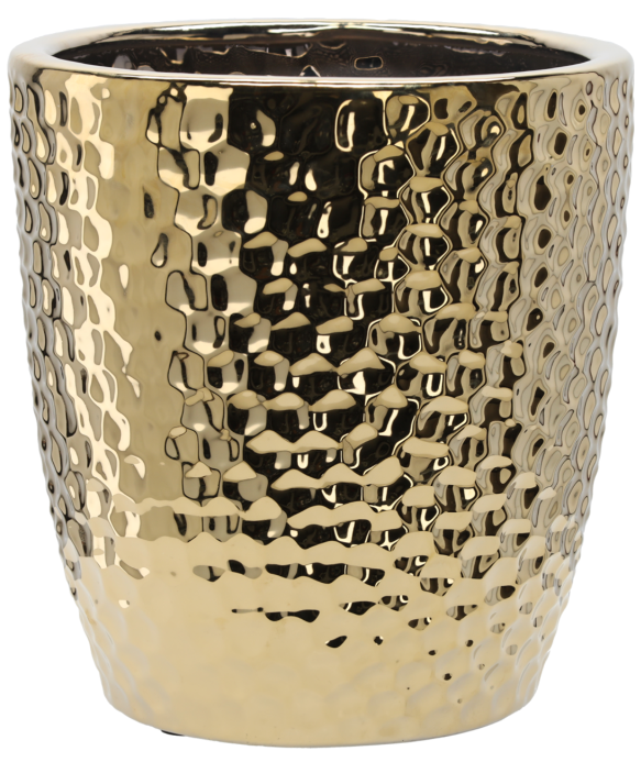 Ovaj prestižni keramički lonac u prepoznatljivoj zlatnoj boji i s izraženim uzorkom saća spaja suvremenu eleganciju s funkcionalnom estetikom. Njegove precizno oblikovane linije i sjajna površina stvaraju dojam luksuza koji se može osjetiti već na prvi pogled. Sa svojom visinom od 41,5 cm djeluje kao samostalan dekorativni naglasak ili kao savršen omotač za veće sobne biljke koje u njemu ožive u savršenoj ravnoteži između prirode i dizajna. Uzorak saća daje loncu zanimljivu teksturu koja mijenja izgled ovisno o svjetlu, pa će vaš interijer svakog trenutka biti pomalo drugačiji – živ i dinamičan.