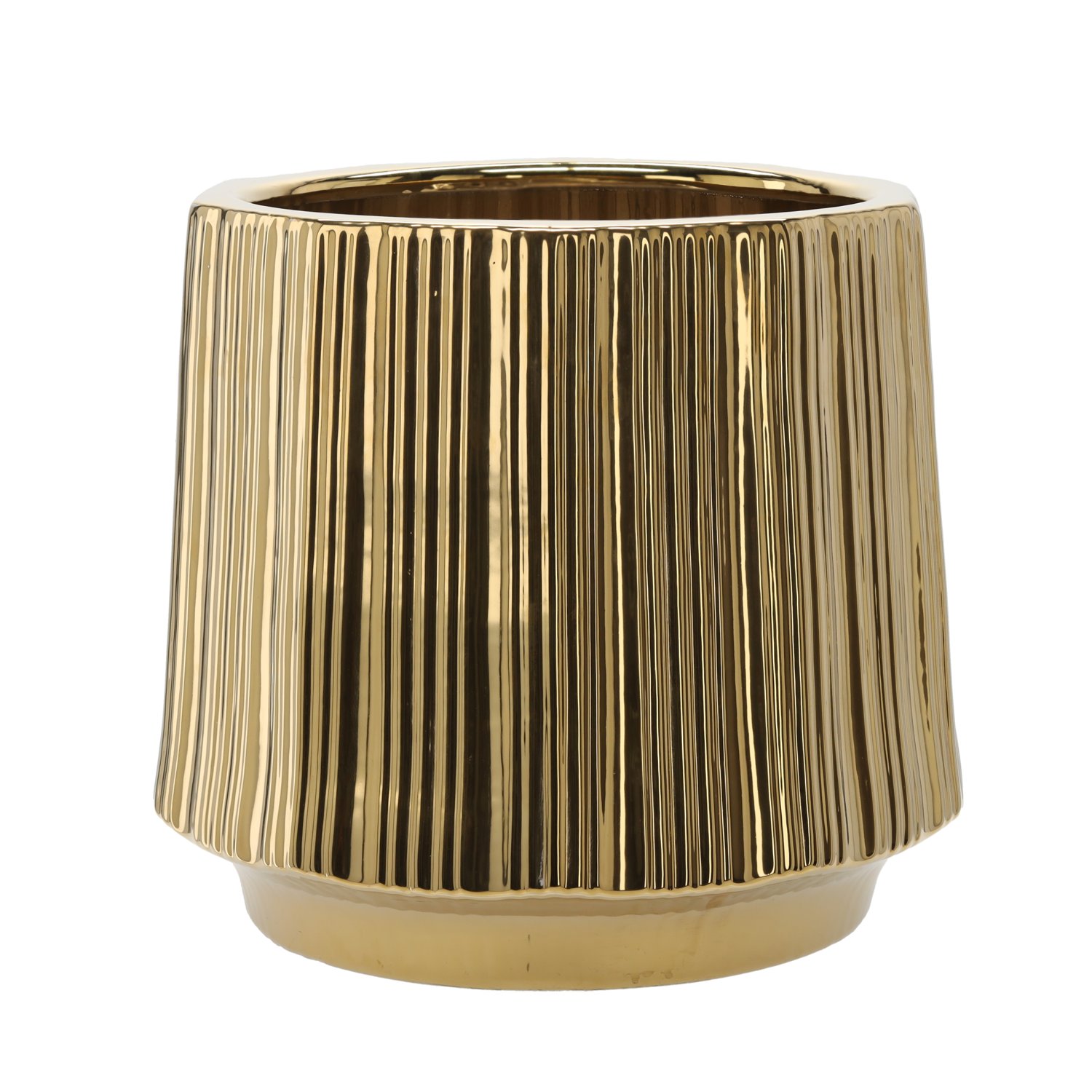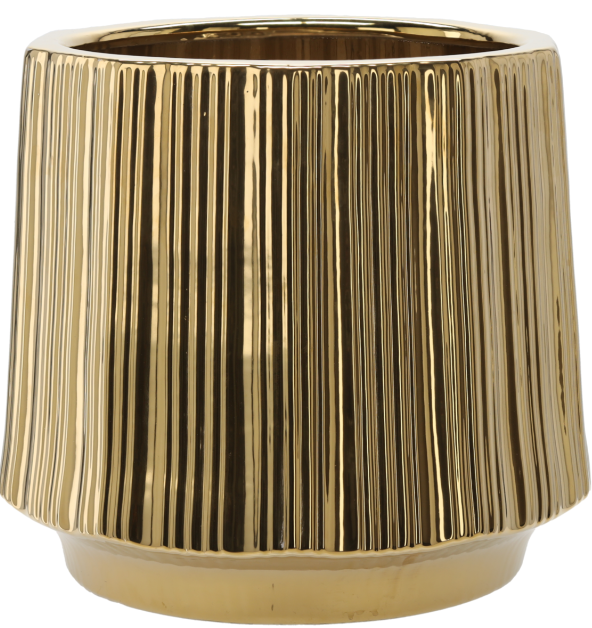 Ovaj raskošni keramički lonac u zlatnoj boji savršen je primjer kako detalji mogu promijeniti ugođaj u prostoru. Dizajniran je kao ukrasni omot za cvjetne lonce i donosi dašak profinjenosti u svaki interijer – od suvremeno minimalističkih dnevnih soba do klasično uređenih predvorja ili hotelskih dvorana. Njegova sjajna površina nježno se poigrava sa svjetlom, stvara tople odsjaje i naglašava strukturu rebraste teksture, koja proizvodu daje dubinu i vizualnu dinamiku. Čvrsta keramika od koje je lonac izrađen osigurava dug životni vijek, otpornost na mehanička oštećenja te jednostavno održavanje, jer se površina lako čisti mekom krpom.
