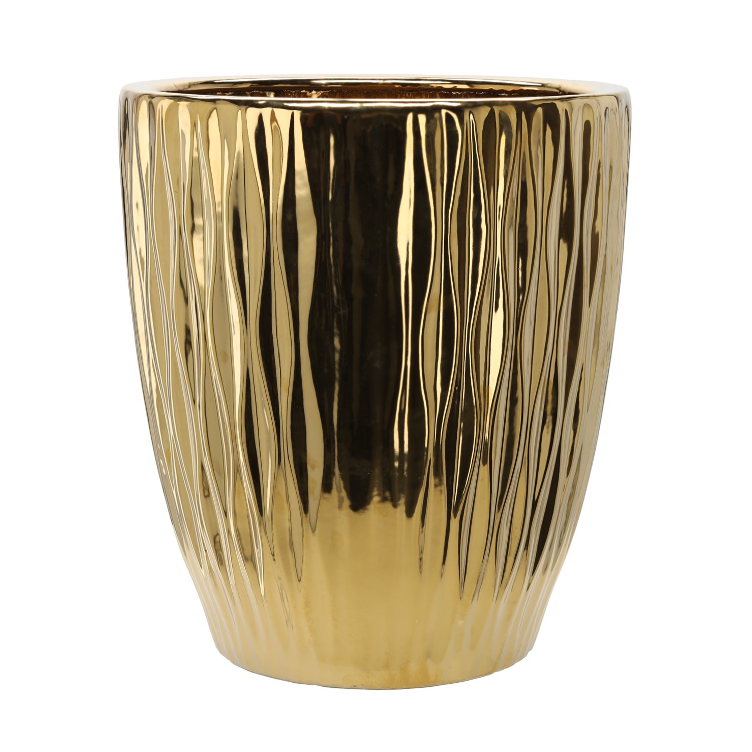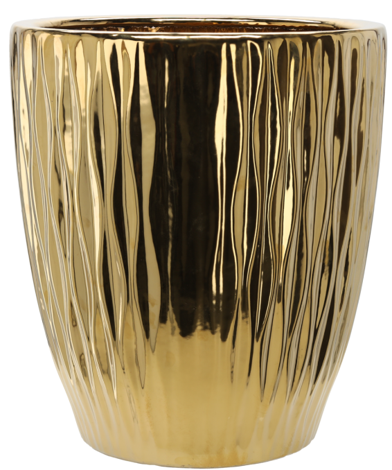 Osim dekorativne uloge, posuda ima i izraženu funkcionalnu vrijednost. Zbog svoje visine od 51,5 cm omogućuje sadnju biljaka s duljim korijenjem, dok širina od 45 cm pruža dovoljno prostora za razgranavanje. Dno posude oblikovano je tako da osigurava stabilnost i kod većih biljaka, čime se smanjuje rizik od prevrtanja. Zlatna vanjština lijepo se slaže sa zelenim i cvatućim biljkama jer naglašava njihove prirodne tonove. U kombinaciji s biljkama velikih listova ili visećim izdancima nastaje učinak luksuznog biljnog aranžmana koji privlači svaki pogled.