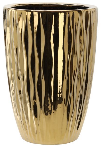 Keramička ukrasna posuda marke Chomik dizajnirana je za sve koji cijene spoj suvremenog dizajna, kvalitetnih materijala i bezvremenskog sjaja. Njezina zlatna, sjajna obrada donosi osjećaj luksuza i topline u svaki prostor – od dnevne sobe do poslovnog ambijenta. Površina posude suptilno je urezana s okomitim utorima koji stvaraju zanimljivu igru svjetla i sjene te dodaju teksturalnu dubinu. Tako posuda ne djeluje samo kao spremnik za biljke, već i kao samostalan dekorativni element koji privlači poglede i naglašava estetiku prostora.