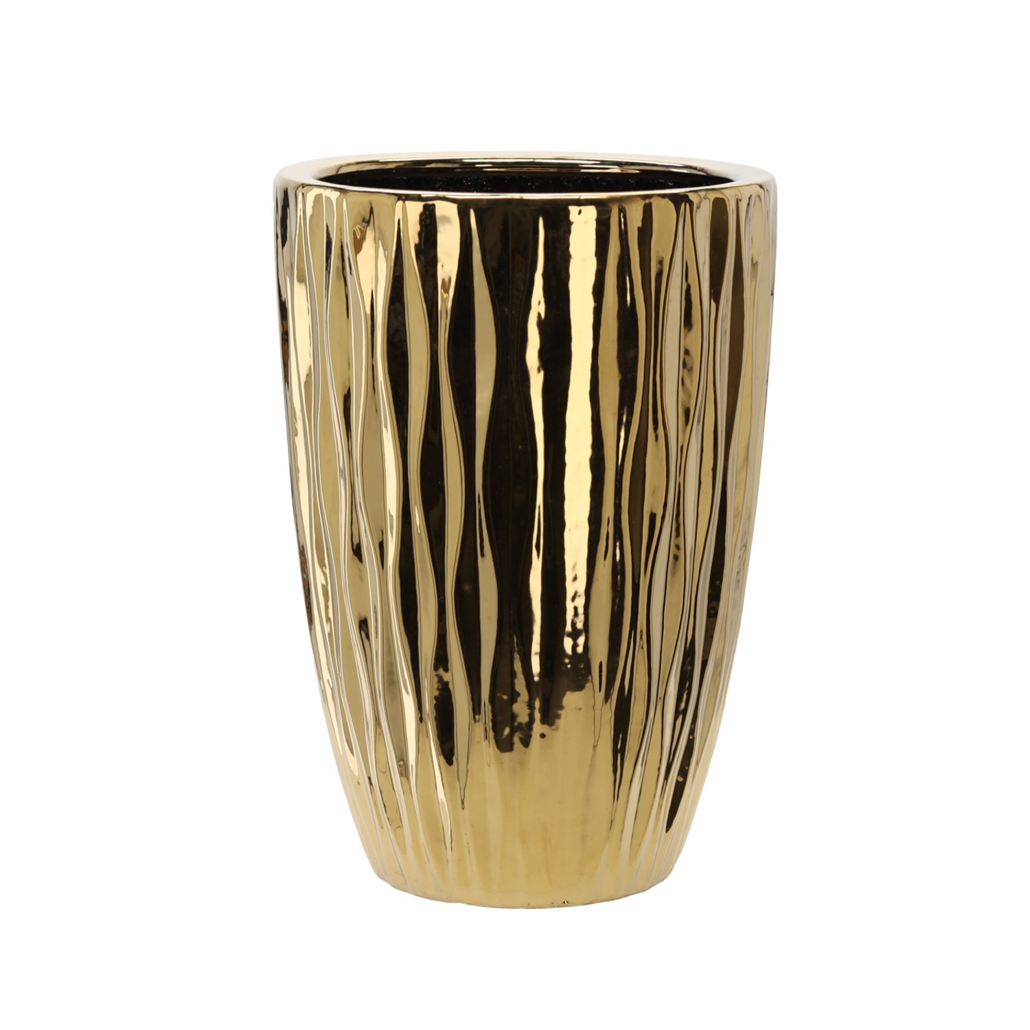 Posuda ima uravnotežene dimenzije 37×37×46 cm, što omogućuje svestranu upotrebu. Prikladna je za različite vrste lončanica – od bujnog zelenila do cvjetajućih sorti koje zahtijevaju stabilnu i prostranu osnovu. Zlatna boja sa sjajem djeluje kao elegantan kontrast živim bojama biljaka, a istodobno naglašava njihove prirodne tonove. Zbog svoje visine posuda je idealna i za postavljanje uz kauč, u hodnik ili na prostrane police, gdje dodaje dašak prestiža i urednosti. Njezina keramička struktura osigurava stabilnost, stoga se posuda ne prevrće lako, a pritom zadržava svjež izgled kroz godine.