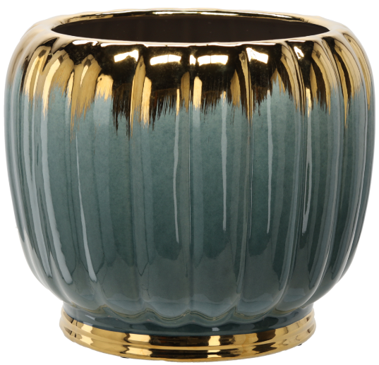 Kombinacija zlatne i zelene boje unosi u prostor osjećaj topline, mira i profinjenosti. Zlatna boja simbolizira raskoš i svjetlost, dok zelena podsjeća na prirodu, svježinu i ravnotežu. Kada se te dvije boje spoje na površini ovog lonca, nastaje dekorativni element koji nije samo funkcionalan, već i izražen oblikovni naglasak. Reljefna tekstura na keramici dodaje dubinu i taktilni učinak, zbog čega lonac djeluje kao umjetnički komad, a ne samo kao pomoćno sredstvo za sadnju biljaka. Sjajna glazura osigurava da se svjetlost nježno odbija, čime lonac dobiva poseban sjaj koji se može promatrati iz različitih kutova.