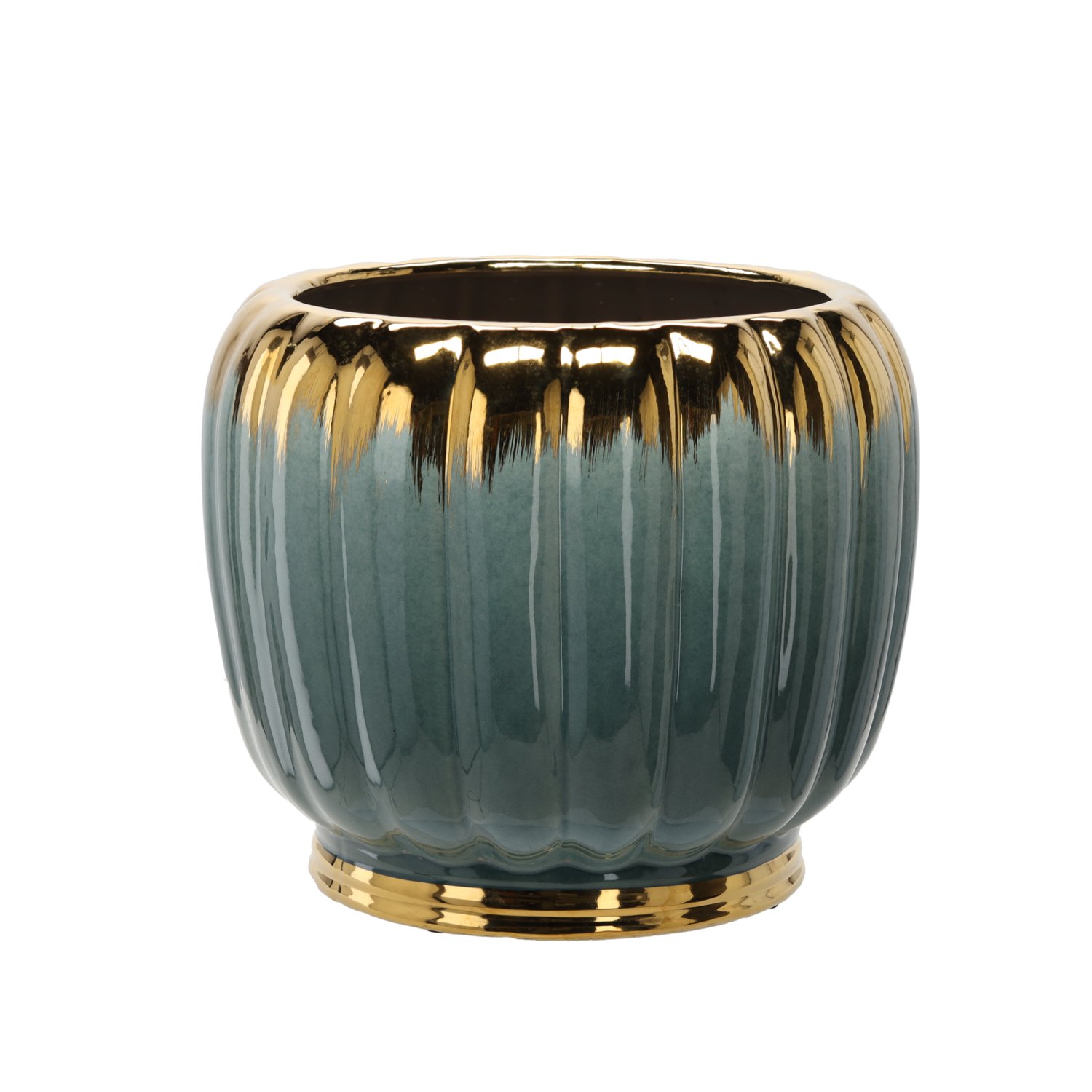 Ovaj prekrasan keramički ukrasni lonac u kombinaciji zlatno-zelene boje predstavlja savršenu ravnotežu između elegancije, suvremenog dizajna i praktičnosti. S dimenzijama 41×41×34,5 cm nudi dovoljno prostora za različite vrste lončanica, pri čemu njegov stabilan oblik i uravnotežena težina osiguravaju pouzdanu potporu i većim biljkama. Površina lonca je reljefno obrađena i prekrivena sjajnom glazurom, koja pod svjetlom stvara ugodne odsjaje i dodatno naglašava dubinu boje boce te prestižni sjaj zlata. Izrađen je od kvalitetne keramike, koju odlikuju trajnost i otpornost na mehanička oštećenja – svojstva zbog kojih proizvod zadržava svoju ljepotu i nakon mnogo godina upotrebe.
