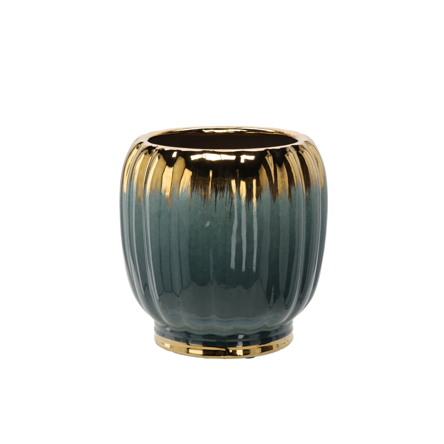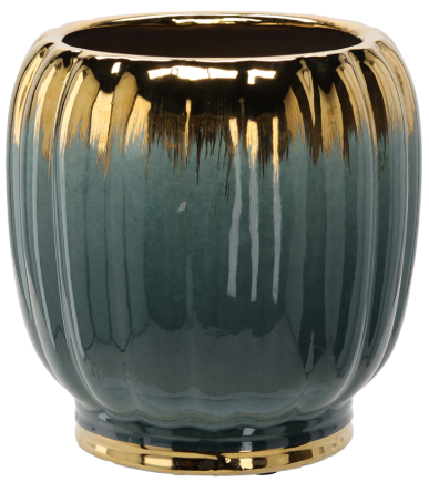 Ova elegantna ukrasna posuda od keramike u kombinaciji zlatne i boce zelene boje savršen je naglasak za svaki interijer. Njezina profinjena žljebasta struktura i sjajna glazura stvaraju dojam luksuza, a istovremeno zadržavaju prirodan, topao karakter materijala. S dimenzijama 28×28×28,5 cm idealna je za različite vrste lončanica ili kao samostalan dekorativni element koji prostoru dodaje dašak suvremene elegancije.