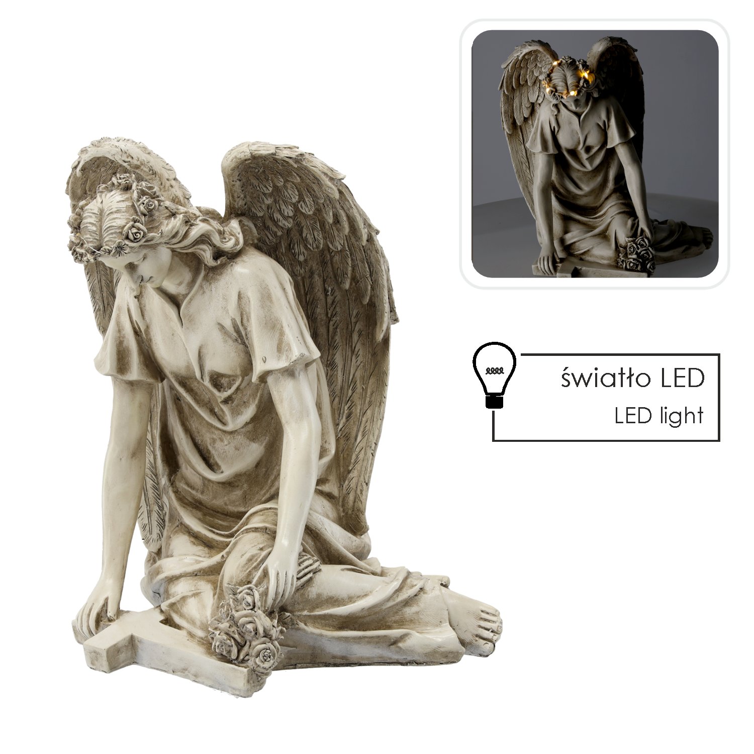 Motiv anđela s križem i buketom tradicionalno je povezan s mirom, zaštitom i nadom. Figura predstavlja spokoj i tihu prisutnost sjećanja na voljene osobe koje više nisu među nama. Bež nijansa djeluje prirodno i elegantno, a istovremeno se lijepo uklapa s različitim materijalima i bojama nadgrobnih spomenika ili grobljanskog cvijeća. Zbog nježno obrađene površine i preciznih detalja u krilima, kosi te draperiji odjeće, figura ima realističan, a istovremeno mekan izgled koji privlači pogled, a da nije nametljiv.