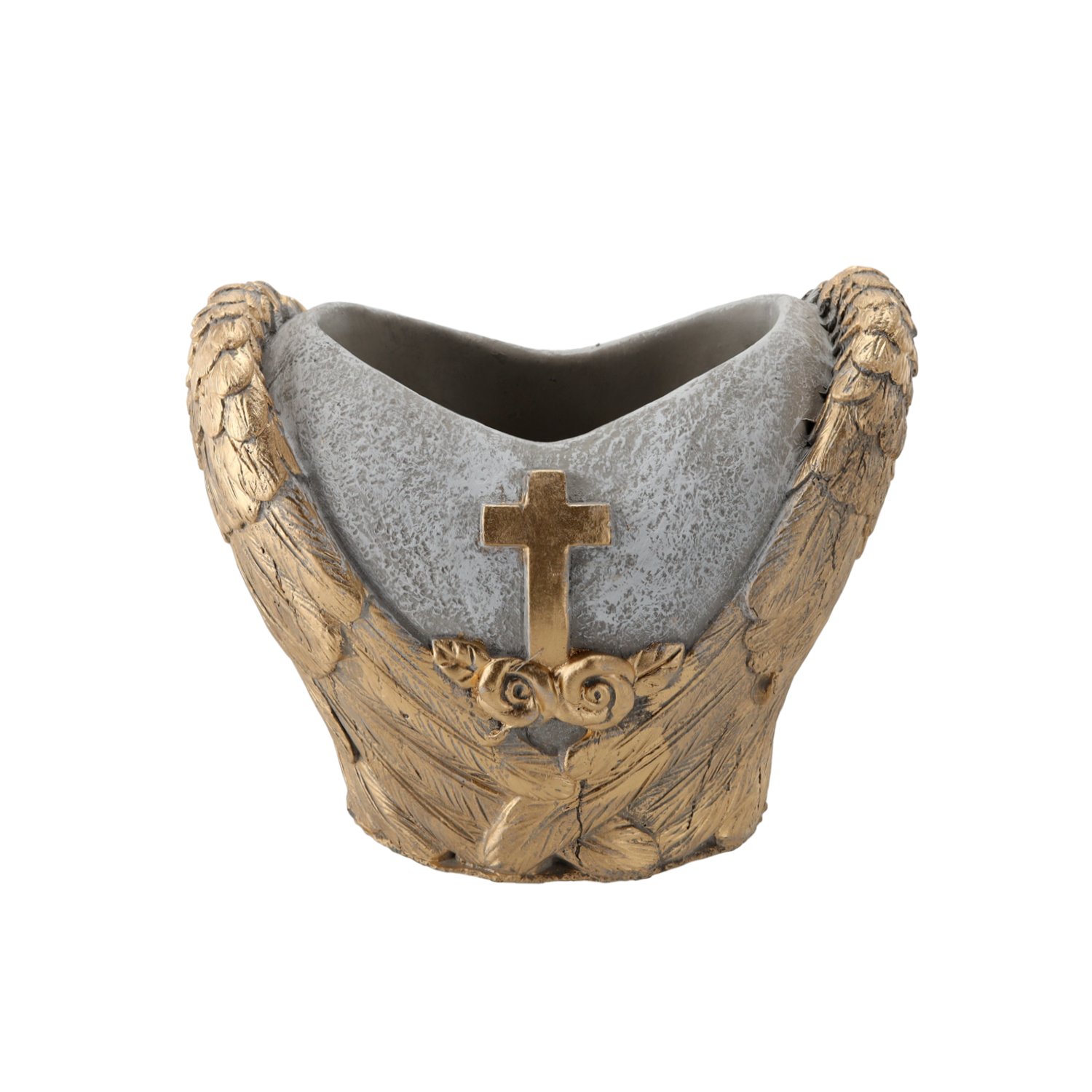 Ako tražite proizvod koji spaja estetsku dovršenost, simbolično značenje i dug vijek trajanja, tada je ovaj cementni lonac u obliku srca sa zlatnim krilima savršen izbor za vaš spomen-kutak.