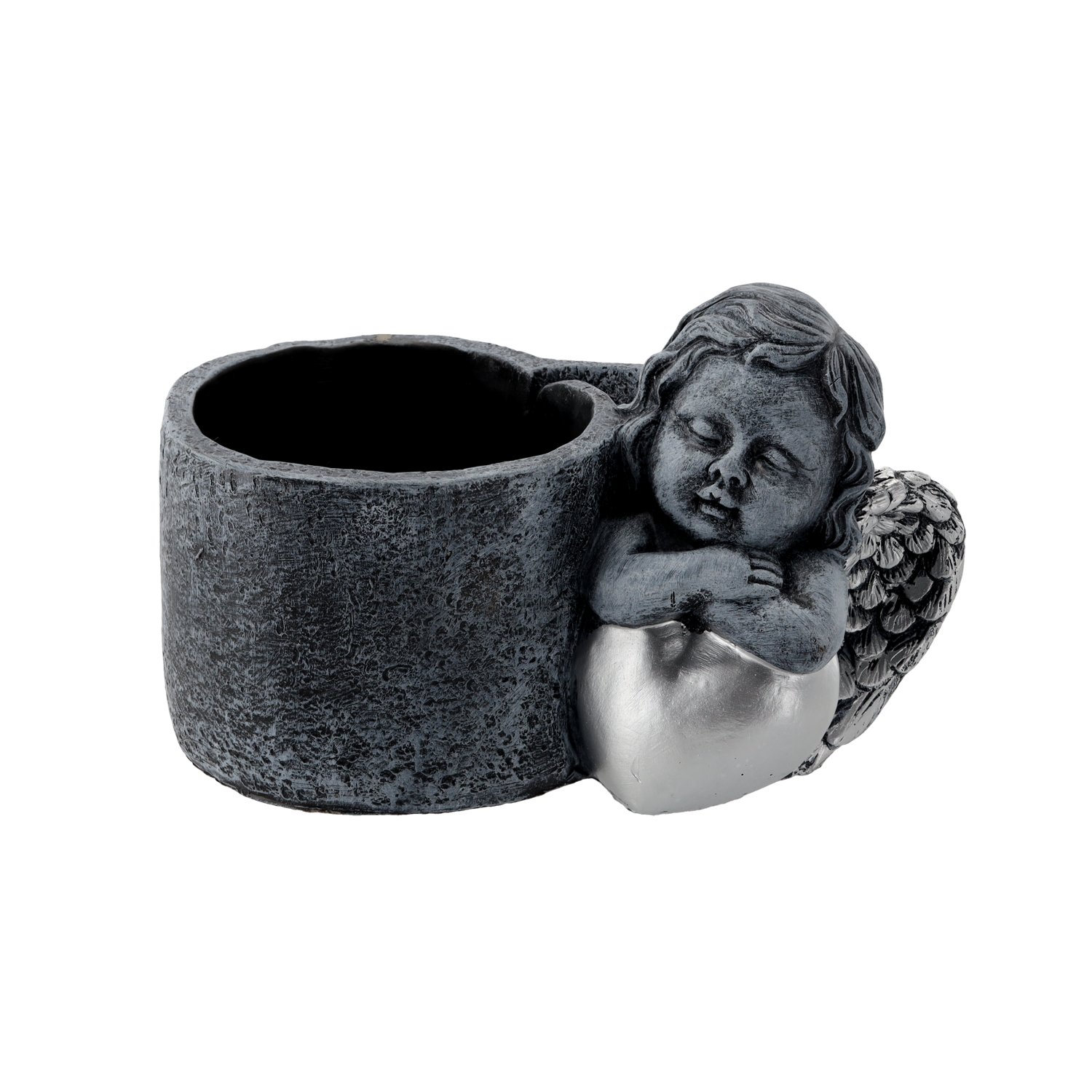 Anđelčić kao središnji motiv nadgrobne posude ima duboku simboliku – predstavlja čuvara mira i utjehu za one koji se prisjećaju svojih najmilijih. Svojim diskretnim položajem i nježnim izrazom djeluje kao tihi pratitelj u trenucima sjećanja. Kombinacija tamnosive i srebrne boje daje dašak plemenitosti te omogućuje lako usklađivanje s drugim nadgrobnim dodacima, poput vaza, svijećnjaka ili kamenih ploča. Zahvaljujući univerzalnom dizajnu, posuda se lijepo uklapa u različite vrste nadgrobnih spomenika – od klasičnih do modernijih izvedbi. Njezina je površina blago teksturirana, što daje dojam prirodnog kamena i naglašava detalje reljefnog anđelčića.