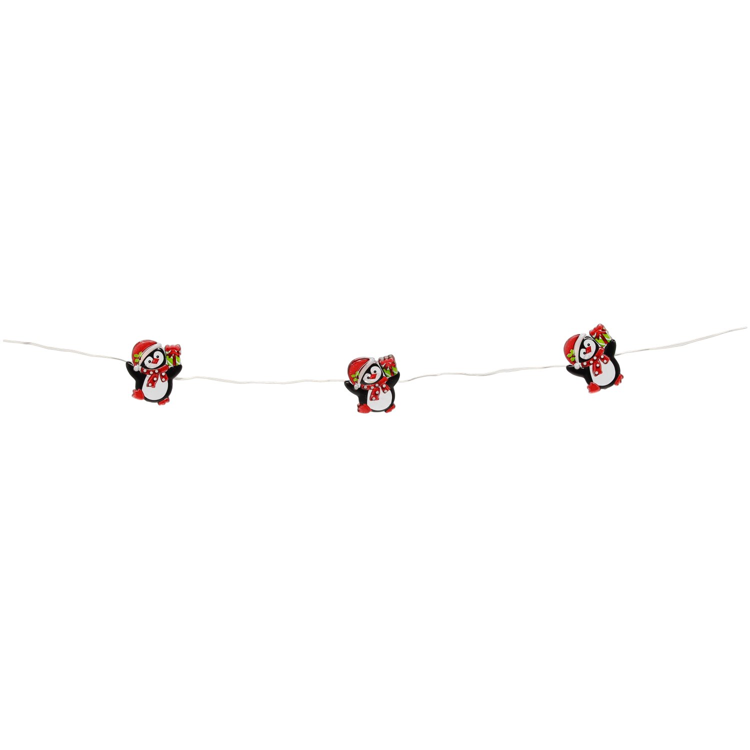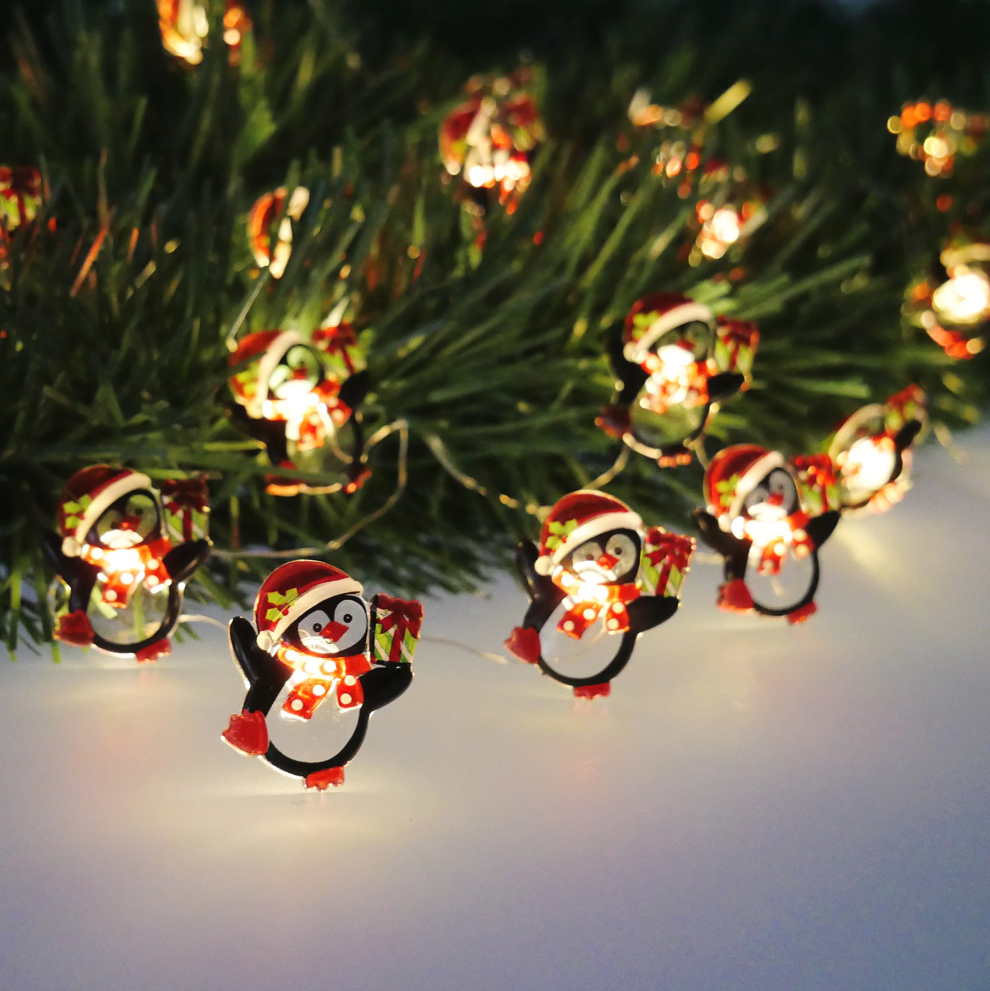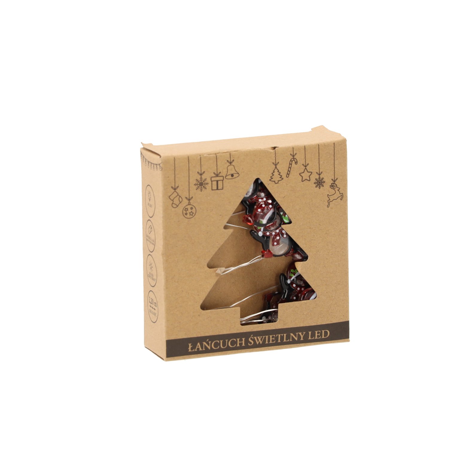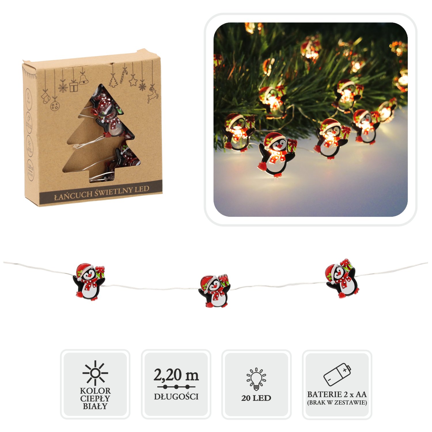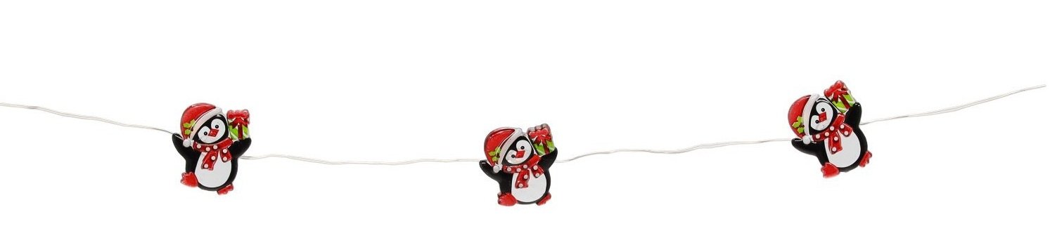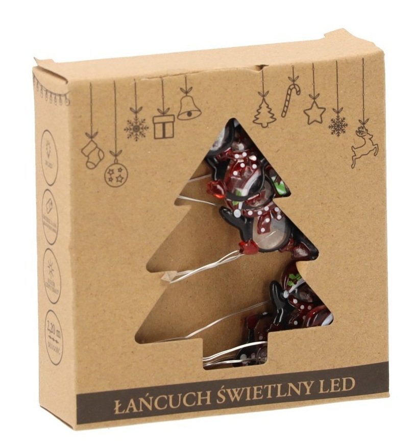 LED svjetlosni lanac Pingvini – Chomik donosi razigran i ugodan dodir zimskog šarma u svaki dom. Dizajniran je s 20 toplo bijelih LED svjetiljki, koje su raspoređene u razmaku od 10 cm i stvaraju meko, privlačno svjetlo. Ukrašen je malim pingvinima u višebojnoj izvedbi, što ga čini idealnim za blagdansku dekoraciju, dječju sobu ili kao sezonski naglasak u dnevnom prostoru. Zahvaljujući napajanju na baterije (2×AA, baterije nisu priložene) nije potrebna priključnica na električnu mrežu, što omogućuje potpunu slobodu pri postavljanju – od police do prozorske daske ili čak božićnog drvca.