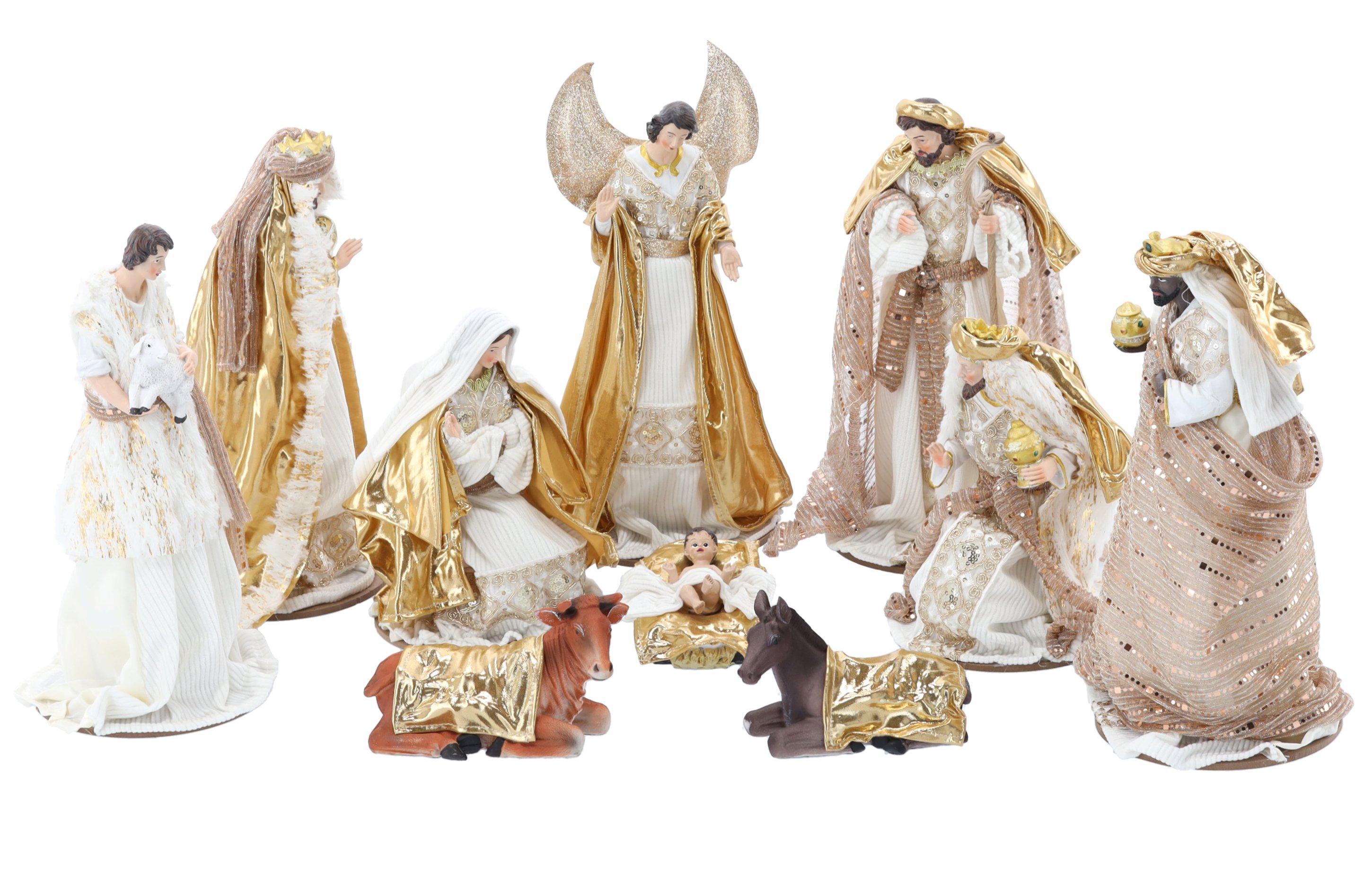 Komplet uključuje sve glavne likove tradicionalnih jaslica, oblikovane s osjećajem za proporcije i detalje. Iako materijal nije naveden, vidljivo je da je svaka figura izrađena s preciznom obradom i pažljivo oslikana. Boje su nježne, višetonke i harmonično usklađene, što omogućuje jednostavno uklapanje u različite tipove unutarnjeg uređenja – od klasičnog do suvremenog.