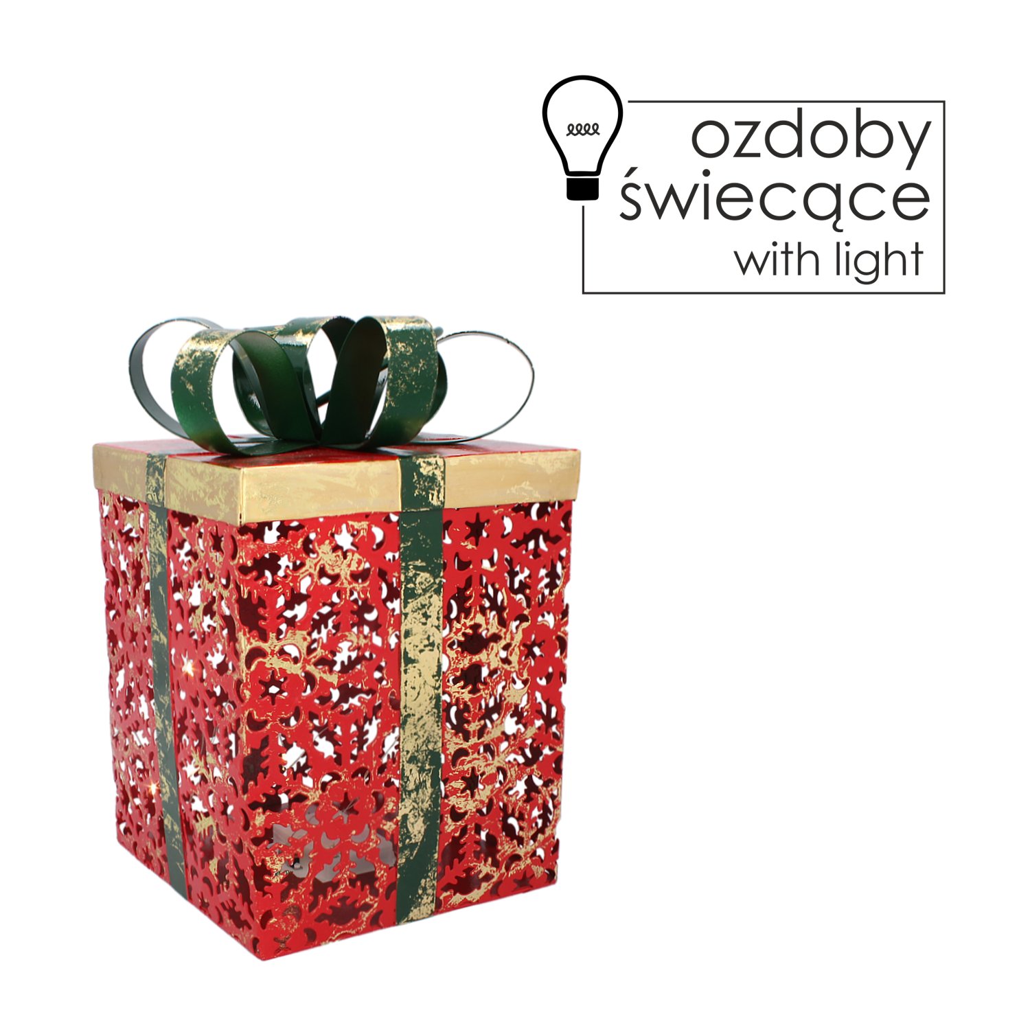 LED rasvjeta, ugrađena u unutrašnjost dekoracije, nježno prosijava kroz mrežastu strukturu metala, što stvara meko, raspršeno svjetlo. Svjetlosni učinak dovoljno je intenzivan da naglasi obrise poklona, a istodobno dovoljno suptilan da ne smeta pogledu i doprinosi osjećaju topline. Dekoracija spada među one dodatke koje možete postaviti na prozorsku dasku, komodu, ispod božićnog drvca ili na vrtni stol. Zbog svog izdržljivog dizajna prikladna je i za natkrivene vanjske prostore, gdje će svijetliti kao ugodan svjetlosni naglasak tijekom zimskih večeri.