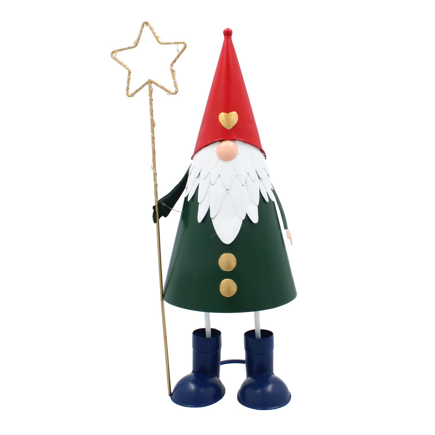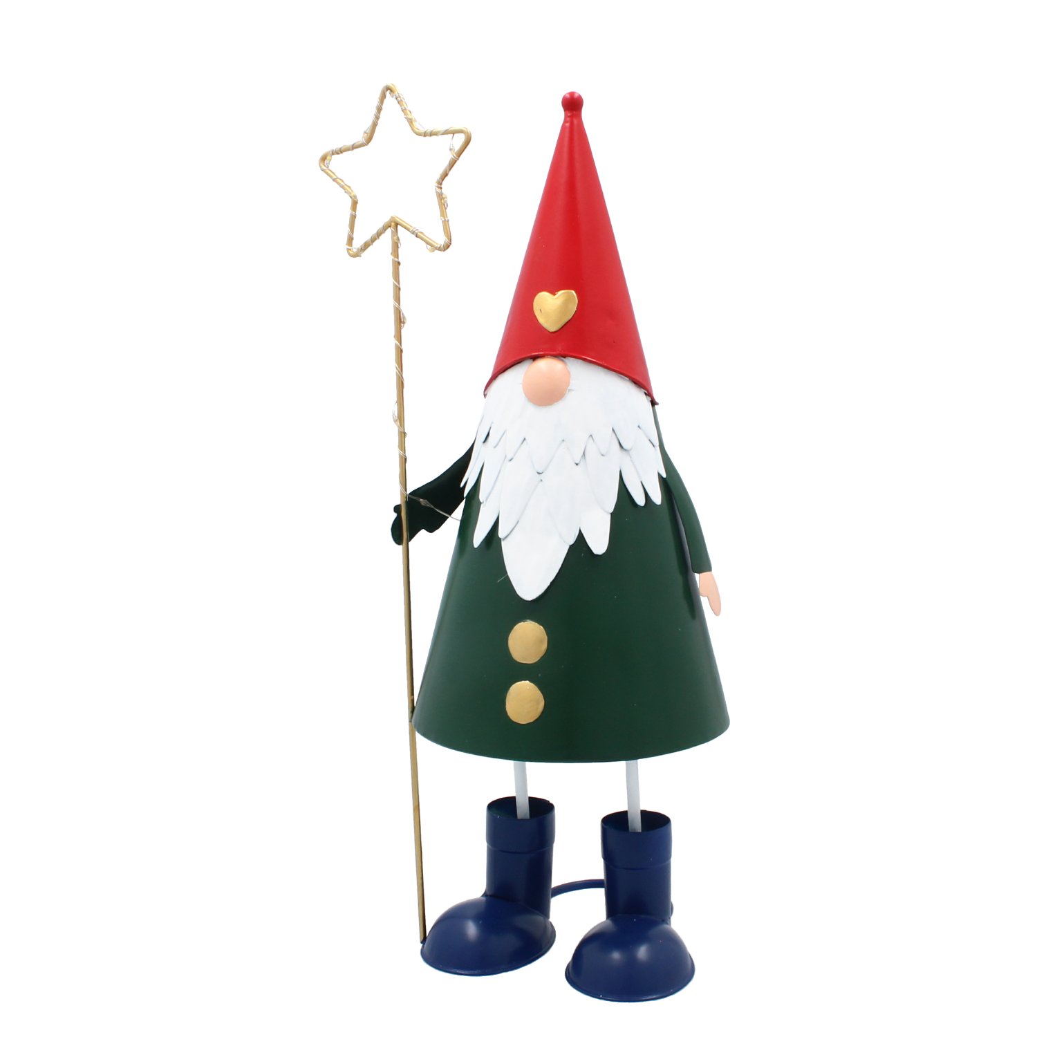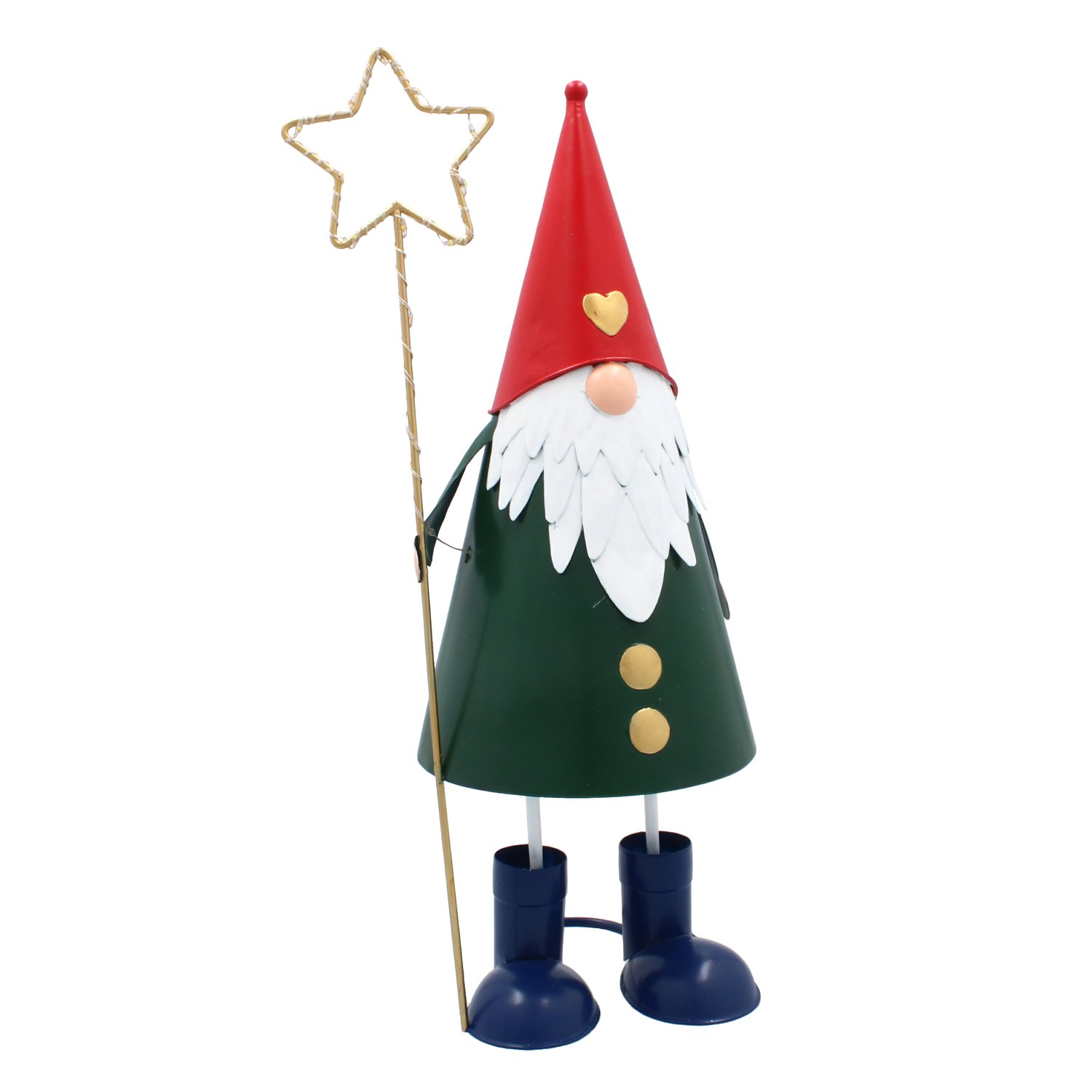 Dimenzije 13 × 13 × 37 cm omogućuju da figura bude dovoljno uočljiva, a da ne zauzima previše prostora. Visina od 37 cm daje patuljku elegantan, ali razigran stav koji odmah privlači pogled. Zvijezda u njegovim rukama djeluje kao svjetlosni naglasak, dok metalni detalji stvaraju ugodan kontrast s toplim sjajem LED svjetla. Takva kombinacija materijala i svjetla karakteristična je za suvremene blagdanske dekoracije koje spajaju tradicionalne motive s modernim dizajnom.