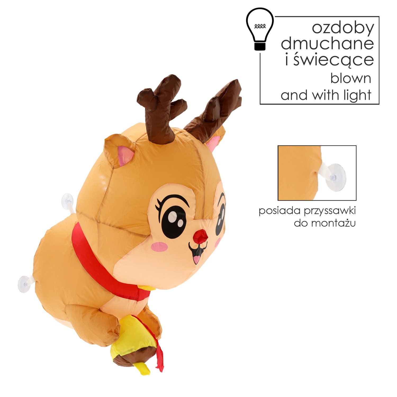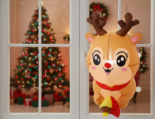 LED rasvjeta i duljina 90 cm: Napuhani sjeverni jelen za prozor – Chomik. Ova blagdanska dekoracija, izrađena od izdržljive plastike otporne na vremenske uvjete, spaja razigrani dizajn s uporabno funkcijom i svjetlosnim učinkom koji u trenutku stvara toplu atmosferu božićnih dana. Napuhani jelen pomoću vakuumskih čašica jednostavno se postavlja na bilo koju glatku površinu, stoga je idealan za prozore, staklena vrata ili čak unutarnje vitrine, gdje želite stvoriti čarobnu zimsku scenu bez potrebe za bušenjem ili dodatnim alatima.