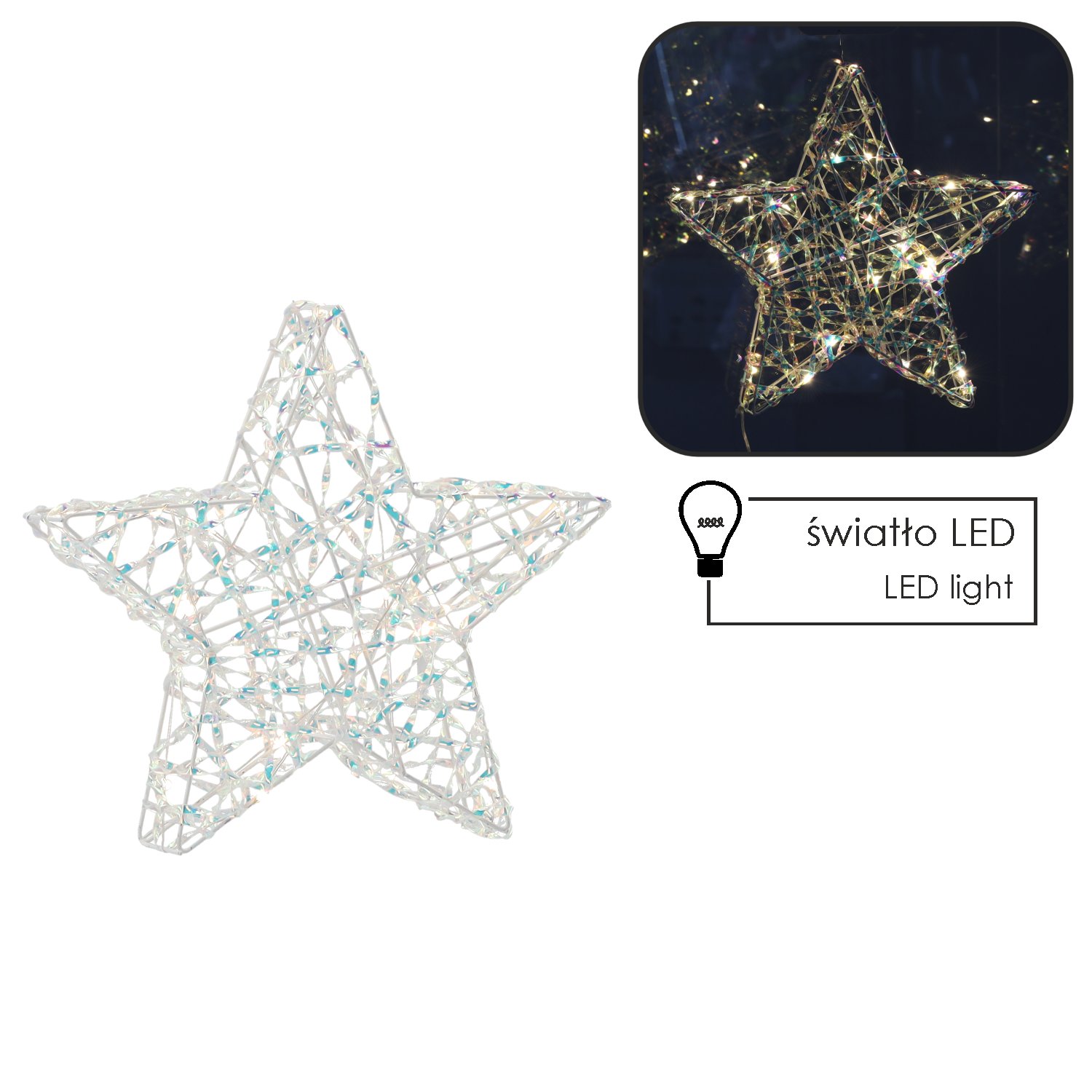 Božićna dekoracija – LED zvijezda s efektom duge marke Chomik profinjen je blagdanski ukras koji svojom nježnom svjetlošću i irizirajućim sjajem stvara pravo blagdansko ozračje. Zvijezda promjera 30 cm odlikuje se kvalitetnom izradom i LED tehnologijom koja nudi energetsku učinkovitost, dug životni vijek te ugodnu, blistavu svjetlost. Proizvod je izrađen u tvornici Chomik u Poljskoj, što jamči provjereno podrijetlo i pouzdanu kvalitetu. Dekoracija je osmišljena tako da se uklapa u najrazličitije blagdanske motive – od klasičnih do suvremenih – te u svaki prostor unosi toplinu i čaroliju.