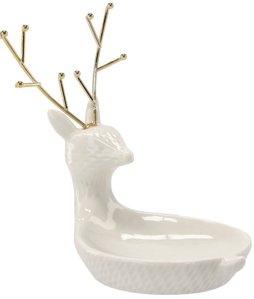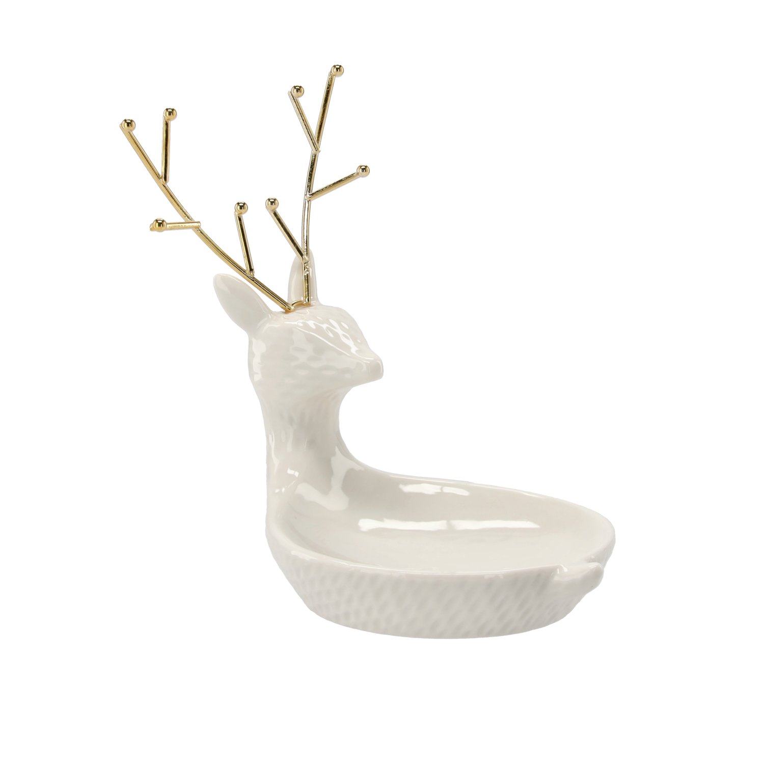Unikatan oblik ležećeg jelena simbol je mira, nježnosti i prirodne ljepote. Blago podignute grane rogova omogućuju praktično vješanje prstenja, narukvica ili lančića, dok se na osnovnoj plohi mogu odlagati manji komadi nakita, poput naušnica ili broševa. Keramička površina je glatka i nježna prema metalnim ili dragocjenim materijalima nakita, pa ne uzrokuje ogrebotine ili oštećenja. Dizajn je uravnotežen, što osigurava stabilnost i kod većih komada nakita.