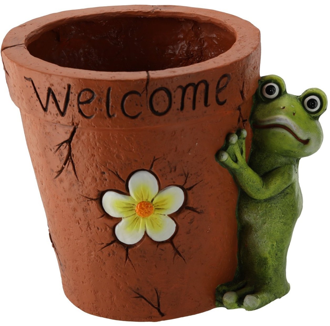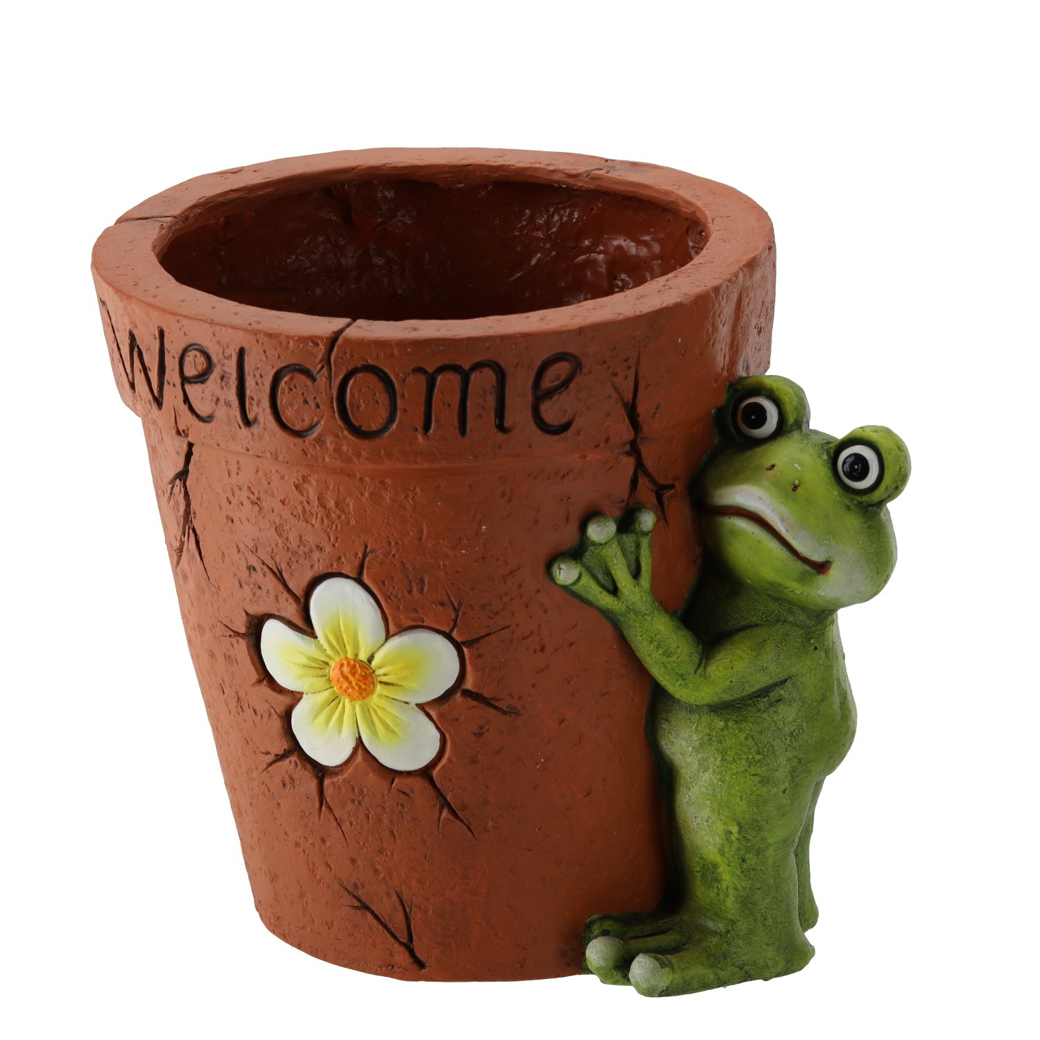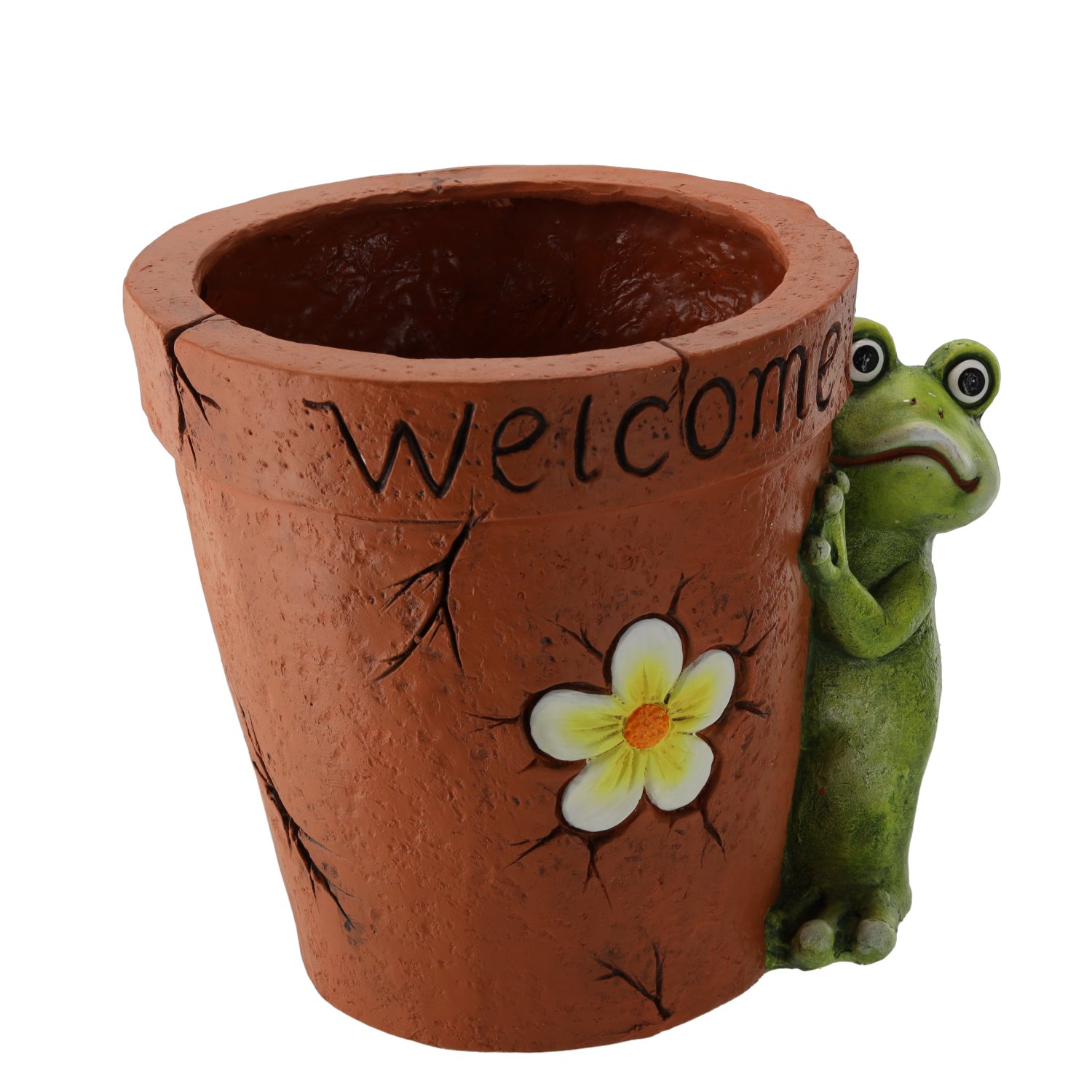Posuda u smeđoj boji lijepo se nadopunjuje s prirodnim materijalima poput drvenih ograda, kamenih rubnjaka ili terakotnih pločica. Dekorativna žaba i cvjetni motiv s natpisom “Welcome” dodaju osjećaj dobrodošlice i razigranosti koji privlače poglede i osmijehe. Vrtna posuda može biti i izvrsna ideja za dar za ljubitelje prirode, vrtlarenja ili dekorativnih dodataka za dom. Zbog svoje svestranosti lijepo pristaje i rustikalnim i modernim vanjskim ambijentima.