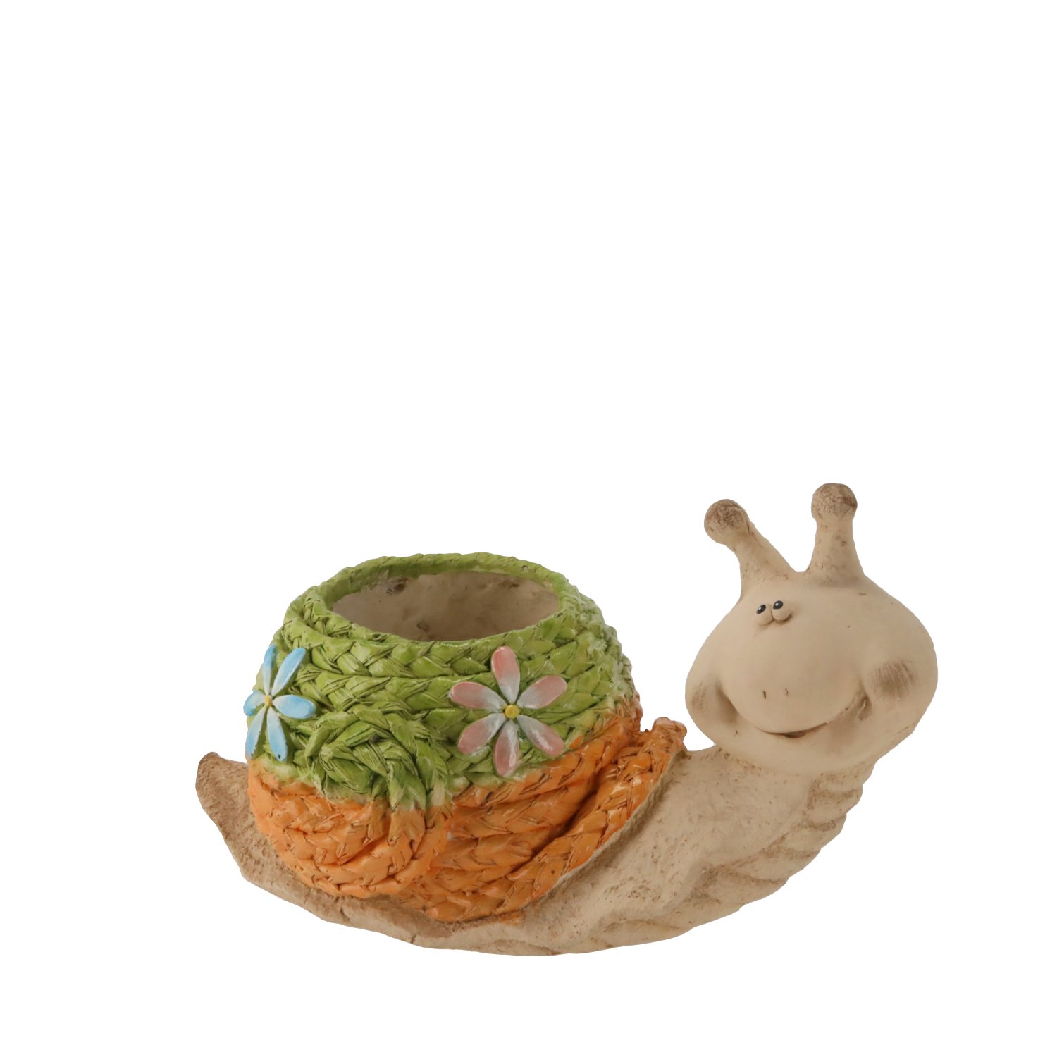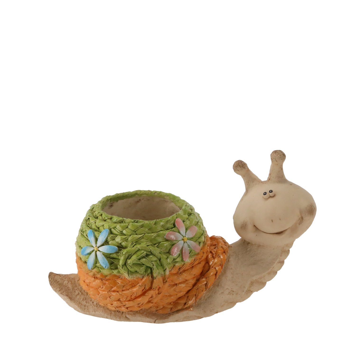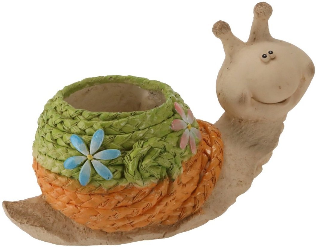 Oblik puža s pletenom ljušturom privlači pažnju svojim razigranim, a istovremeno elegantnim dizajnom. Pletena tekstura ljušture stvara dojam prirodnog materijala koji se lijepo slaže s biljkama i ostalim vrtnim ukrasima. Višebojna površina posude omogućuje da se savršeno nadopunjuje sa zelenim nijansama biljaka te se skladno stapa s okolinom. Takav ukras nije samo posuda za biljke, već i izraz osobnog stila i osjećaja za detalje.
