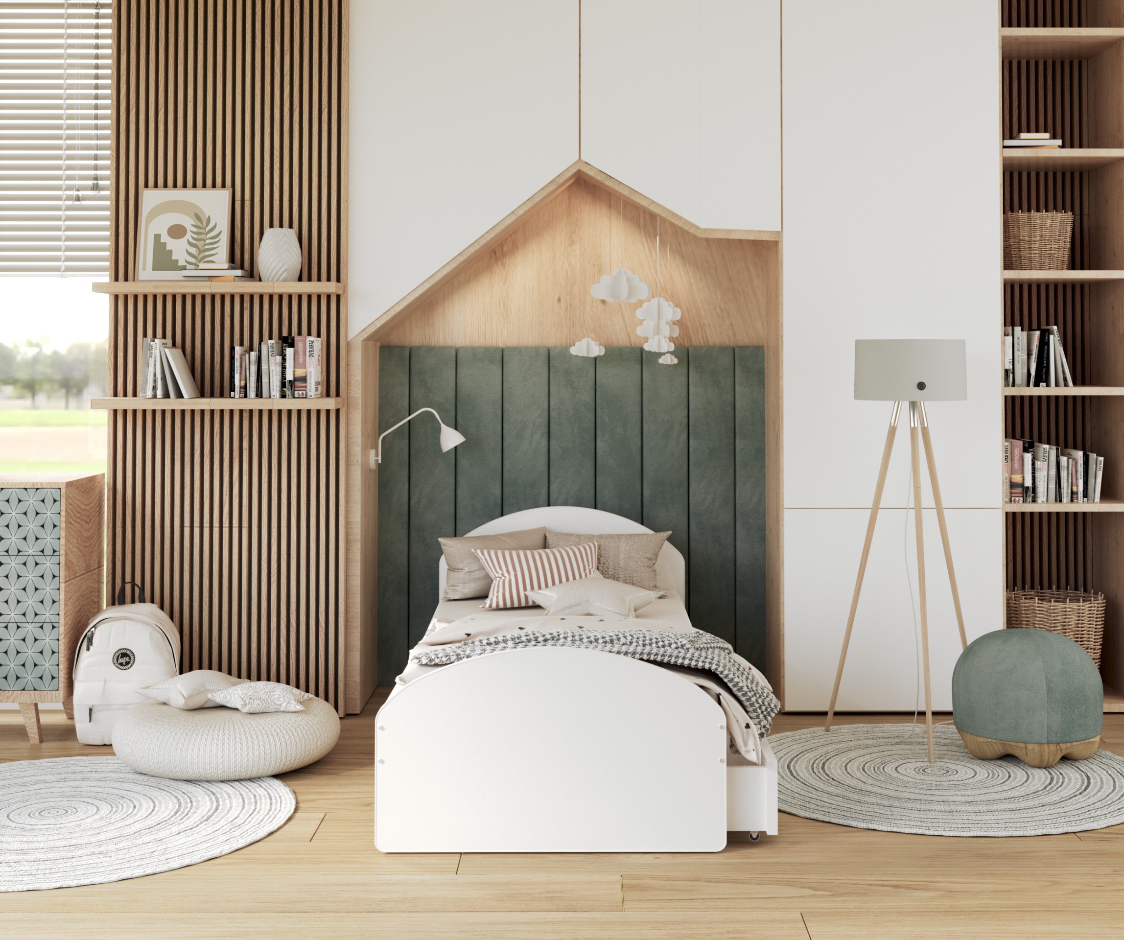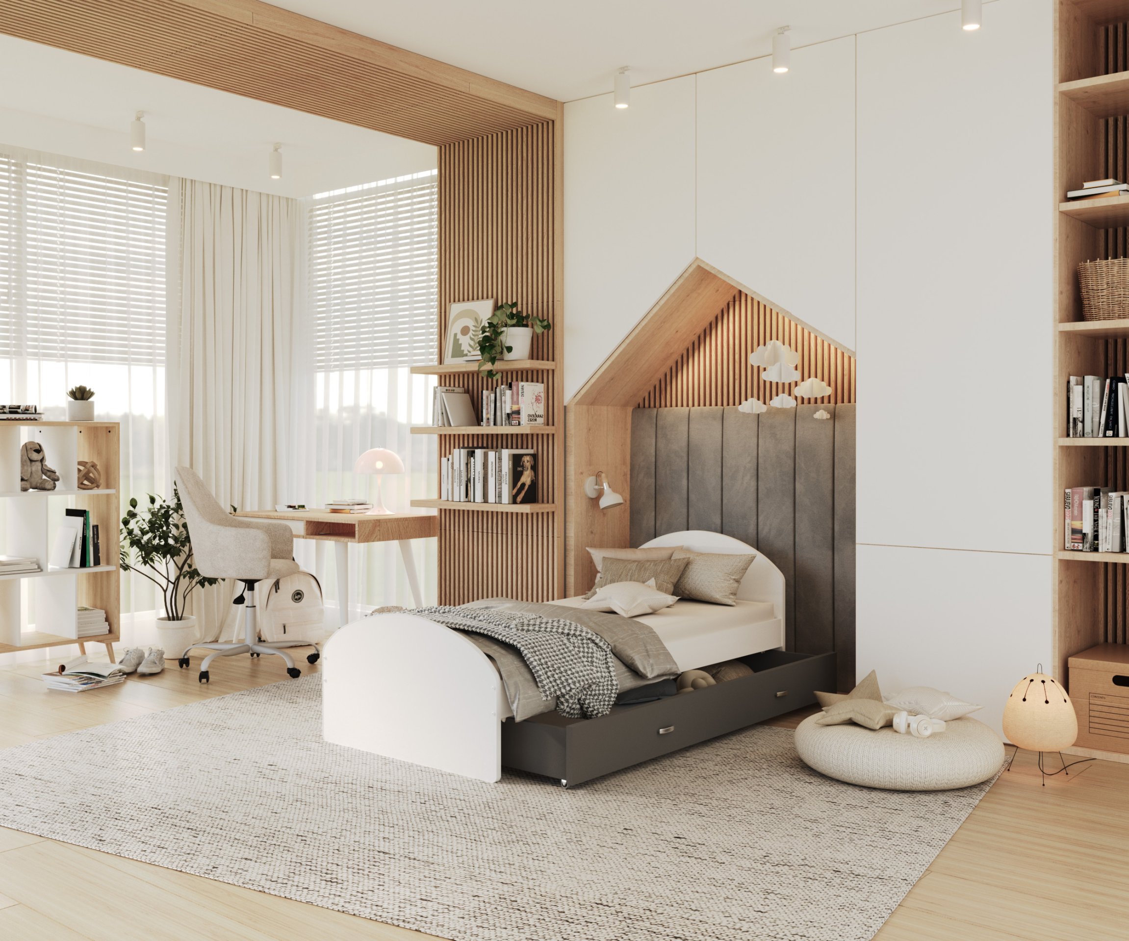 Otroške sobe morajo biti urejene premišljeno, saj prostor pogosto zahteva veliko shranjevanja in prilagodljivosti. Ta postelja je idealna izbira za tiste, ki želijo združiti funkcionalnost in estetiko. Čeprav ne vsebuje predala za posteljnino, jo je zaradi prostega prostora pod ležiščem mogoče kombinirati s škatlami ali zabojčki za shranjevanje igrač, oblačil ali drugih otroških pripomočkov. Tako lahko prostor ostaja urejen, otroška soba pa zračna in prijetna.