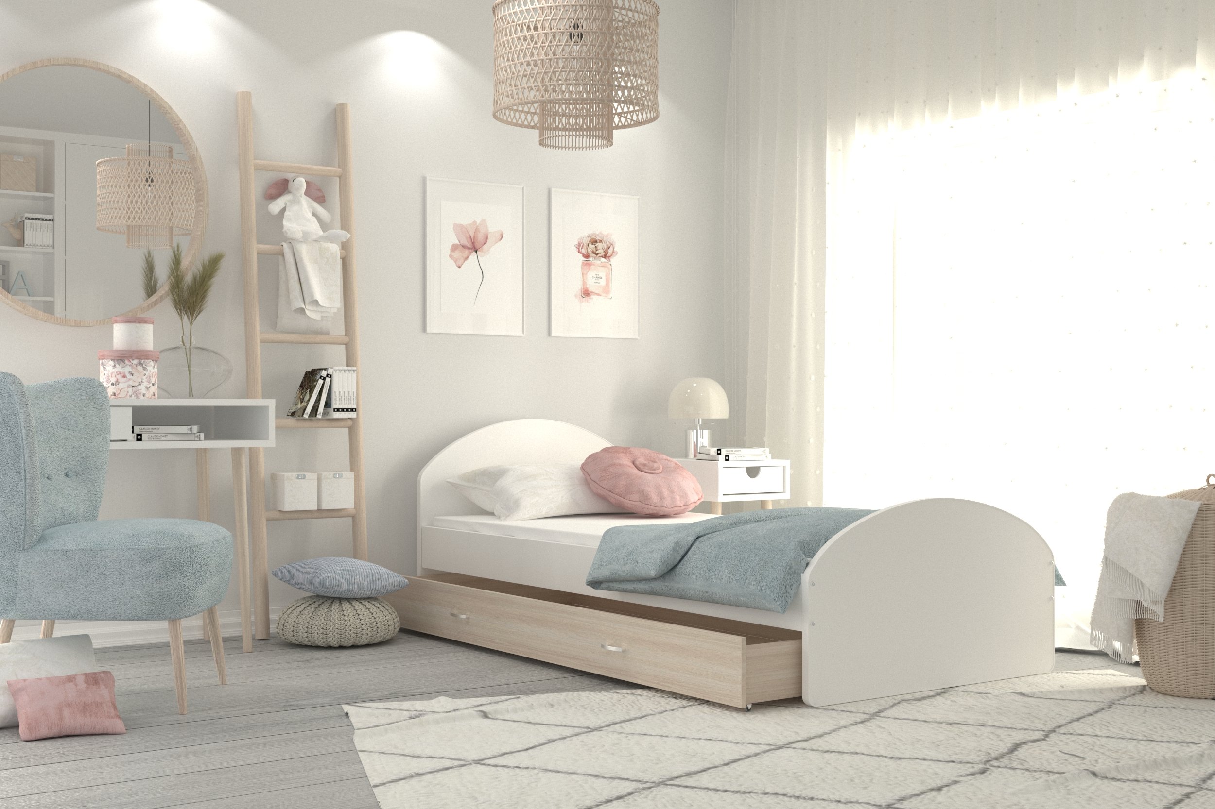 Iščete kakovostno, varno in estetsko dovršeno rešitev za otroško sobo? Ta elegantna otroška postelja dimenzij 90x200 cm združuje praktičnost, udobje in privlačen dizajn, ki bo navdušil tako starše kot otroke. Izdelana je iz trpežnega iverala, ki zagotavlja dolgo življenjsko dobo, hkrati pa jo odlikuje stabilna konstrukcija in brezčasna bela barva, ki se lepo poda v vsako notranjost. Na voljo je več barvnih različic predalov – bela, roza, svetlo modra, sonoma hrast ali siva – zato jo lahko preprosto prilagodite stilu in osebnosti vašega otroka.