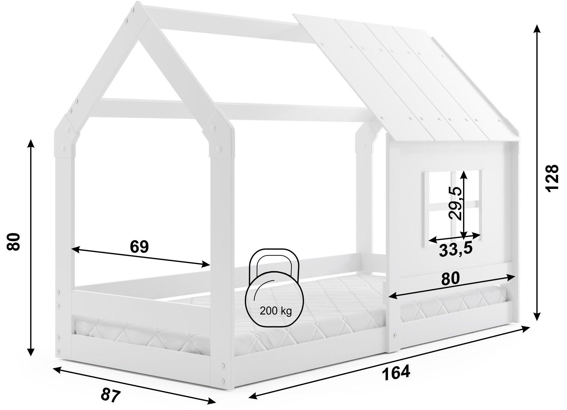 Krevet je izrađen od izdržljivog drva, koje osigurava stabilnost i dug vijek trajanja. Bijela boja dodaje prostoru svježinu i odlično se uklapa s različitim stilovima unutarnjeg uređenja – od klasičnog do modernog. S dimenzijama 87x164x128 cm prikladan je za djecu svih uzrasta, jer omogućuje udoban san, a istovremeno ne zauzima previše prostora u sobi. Zahvaljujući krovu u obliku kućice krevet se pretvara u ugodan kutak, gdje dijete razvija maštu, stvara svoje priče i osjeća se sigurno.