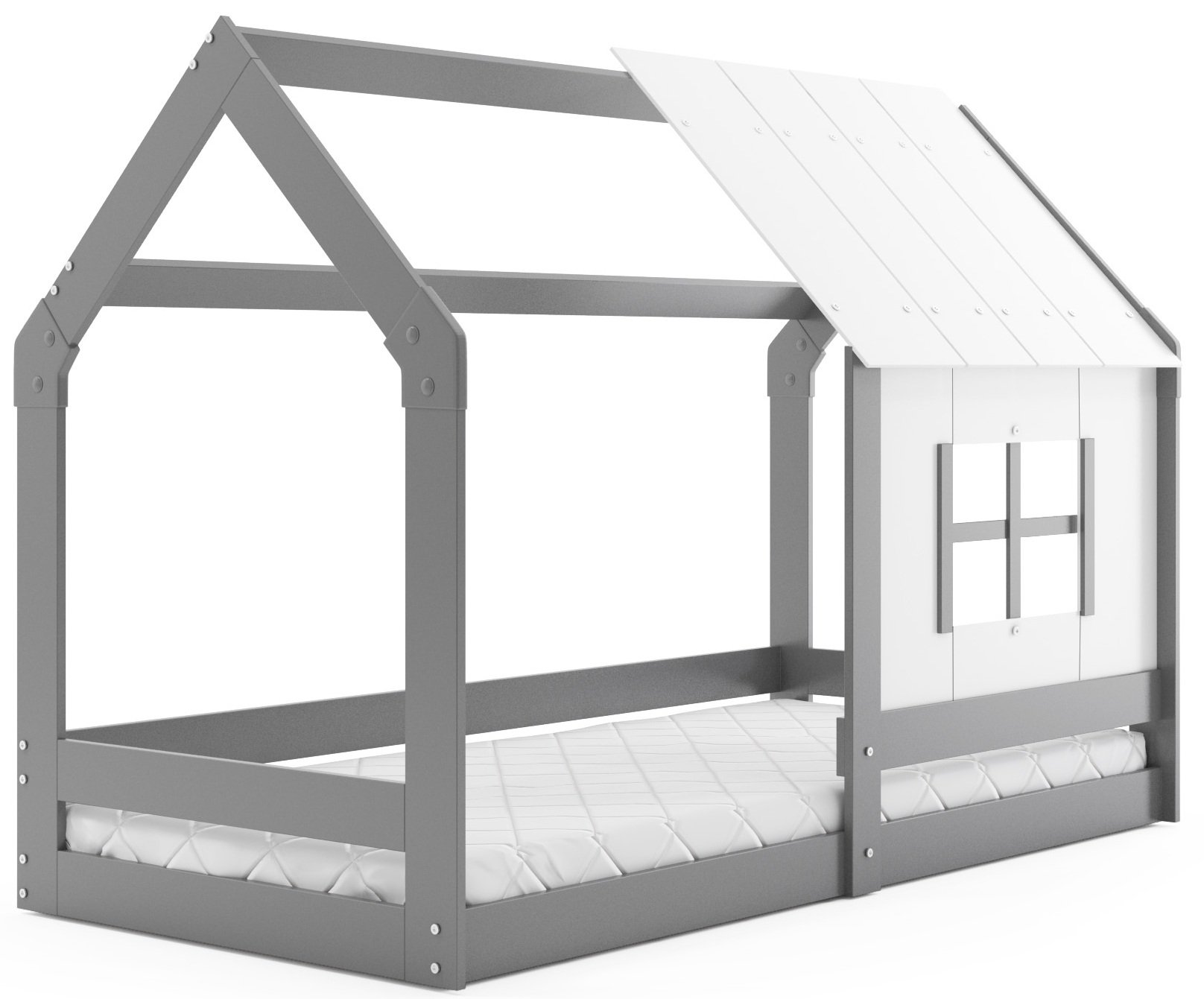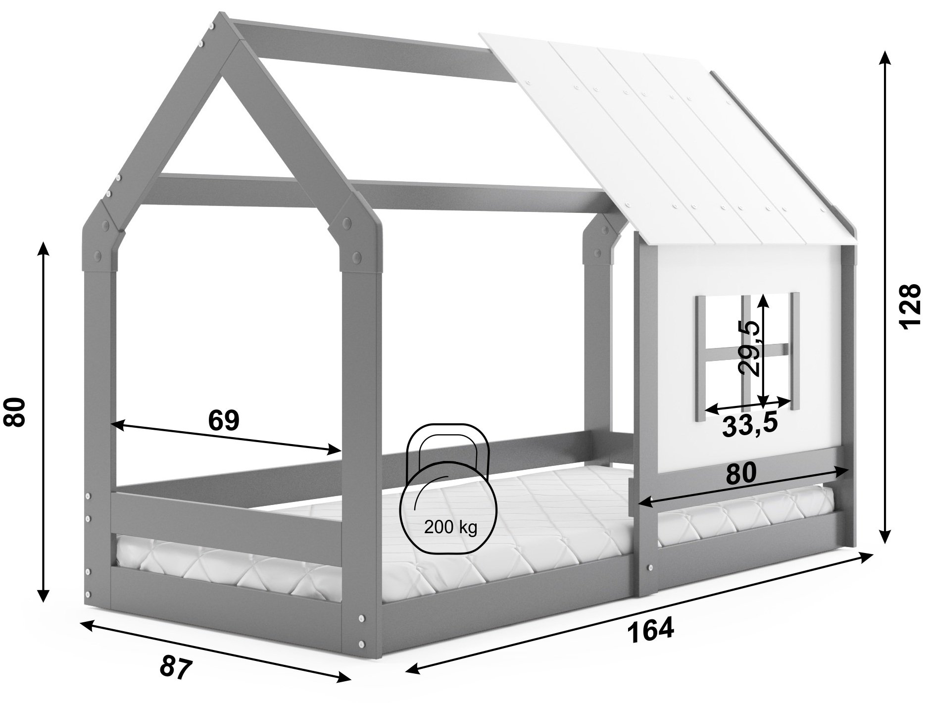 Krevet je izrađen od izdržljivog drva, koje osigurava stabilnost i dug vijek trajanja. Grafitno/bijela boja daje prostoru svježinu i odlično se uklapa s različitim stilovima unutarnjeg uređenja – od klasičnog do modernog. S dimenzijama 87x164x128 cm prikladan je za djecu svih uzrasta, jer omogućuje udoban san i istovremeno ne zauzima previše prostora u sobi. Zahvaljujući krovu u obliku kućice, krevet se pretvara u ugodan kutak gdje dijete razvija maštu, stvara svoje priče i osjeća se sigurno.