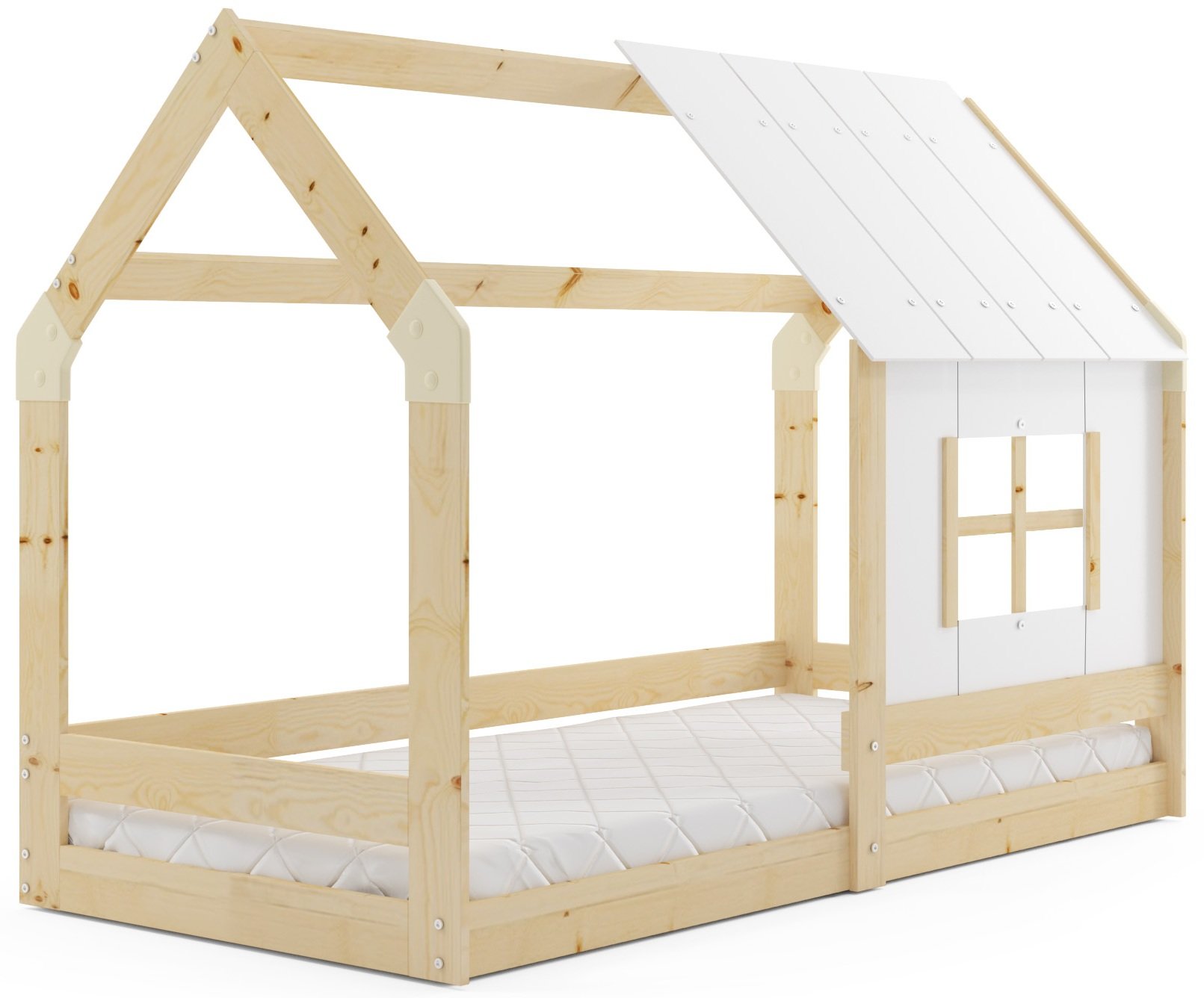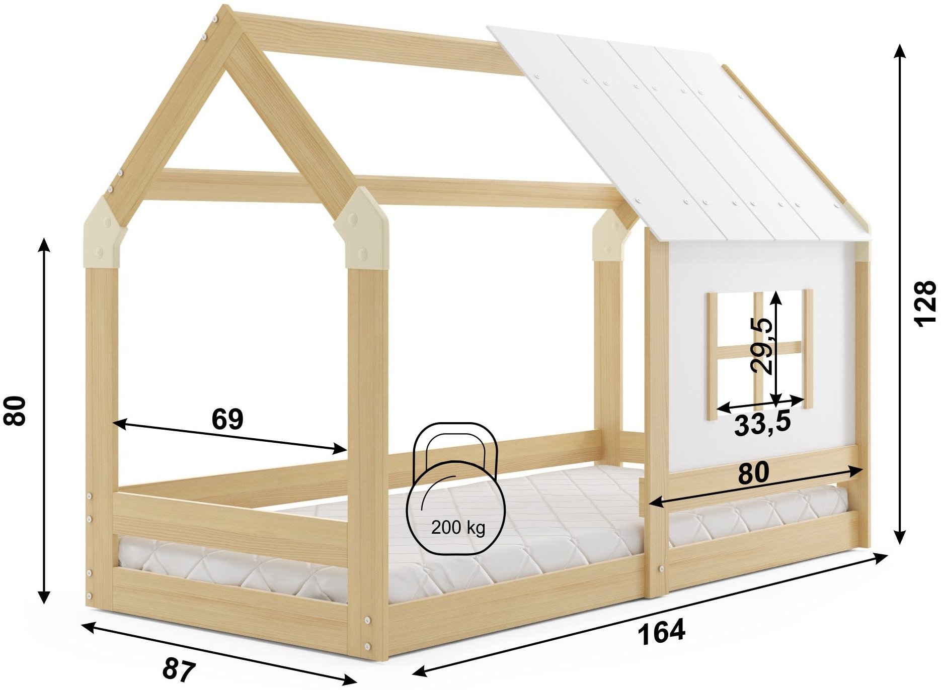 Krevet je izrađen od izdržljivog drveta, koje osigurava stabilnost i dug vijek trajanja. Bor/bijela boja dodaje prostoru svježinu i odlično se uklapa s različitim stilovima unutarnjeg uređenja – od klasičnog do modernog. S dimenzijama 87x164x128 cm prikladan je za djecu svih uzrasta, jer omogućuje udoban san i istovremeno ne zauzima previše prostora u sobi. Zahvaljujući krovu u obliku kućice, krevet se pretvara u ugodan kutak gdje dijete razvija maštu, stvara svoje priče i osjeća se sigurno.