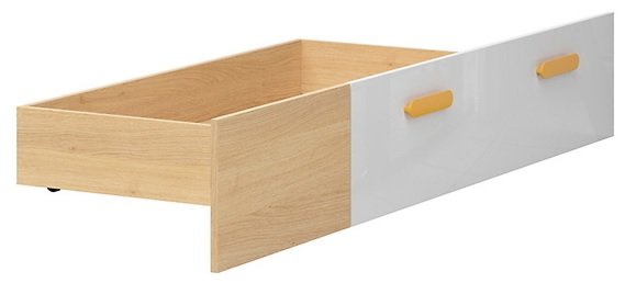 Korpus i okvir u boji poljskog hrasta. Prednja fronta visokog bijelog sjaja i dvije žute ručkice za dodatan vizualni efekt.