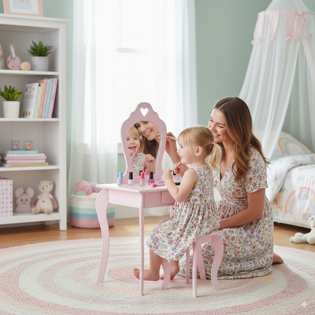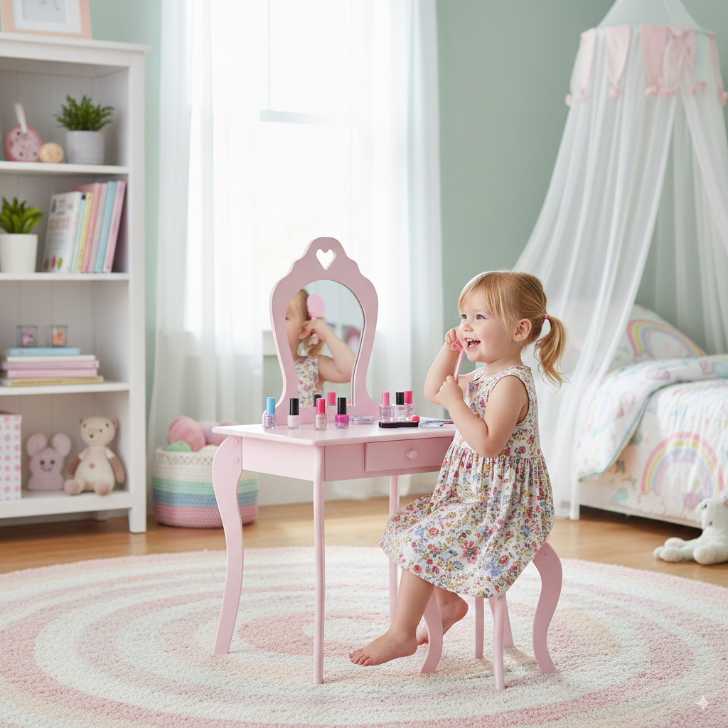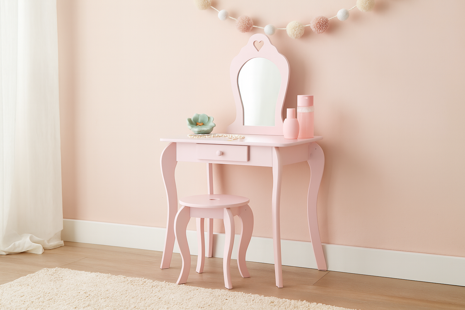 Iako je osnovna namjena stolića kozmetička, može se koristiti i kao mali radni ili dekorativni stolić. Na njegovu površinu možete staviti ogledalo, parfem, nakit ili manje dekoracije koje izražavaju vaš stil. Ružičasta boja lijepo se uklapa s bijelim, sivim ili drvenim nijansama, pa se komplet lako uklapa u različite dekorativne stilove – od skandinavskog minimalizma do romantične klasike ili sobe za mlade.