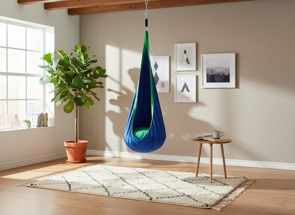 Ovaj kokon idealan je za djecu koja traže svoj miran kutak ili prostor za igru. Oblik kokona nježno obuhvaća tijelo i pruža osjećaj sigurnosti, što doprinosi opuštanju nakon aktivnog dana. U njemu dijete može čitati knjigu, slušati glazbu ili se lagano njihati. Plava tkanina djeluje umirujuće i lijepo se uklapa s različitim kombinacijama boja dječjih soba. Zbog jednostavne montaže lako ga možete premjestiti iz jednog prostora u drugi, što omogućuje višestruku upotrebu tijekom cijele godine.