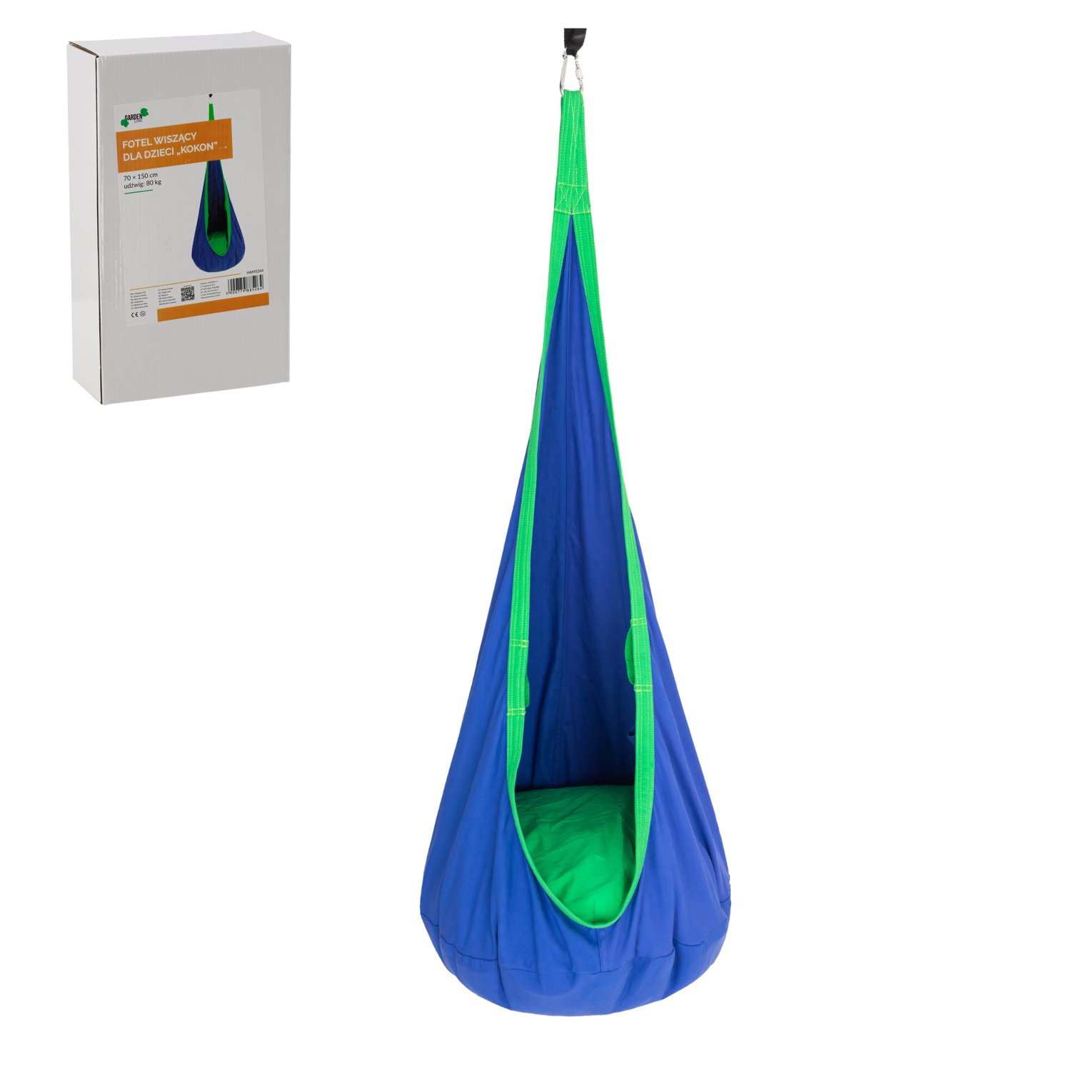 Kokon za djecu – HAM5264 je ugodno viseće sjedalo, namijenjeno opuštanju, igri i odmoru djece od 3. godine starosti nadalje (CE 3+). Svojim mekim oblikom i umirujućom plavom bojom stvara osjećaj sigurnosti i udobnosti, a istovremeno potiče dječju maštu. Proizvod je pogodan za unutarnju i vanjsku upotrebu, pa ga možete objesiti u dječjoj sobi, na terasi ili u sjenovitom dijelu vrta. Maksimalno opterećenje od 80 kg osigurava čvrstu i stabilnu konstrukciju koja omogućuje bezbrižnu upotrebu.