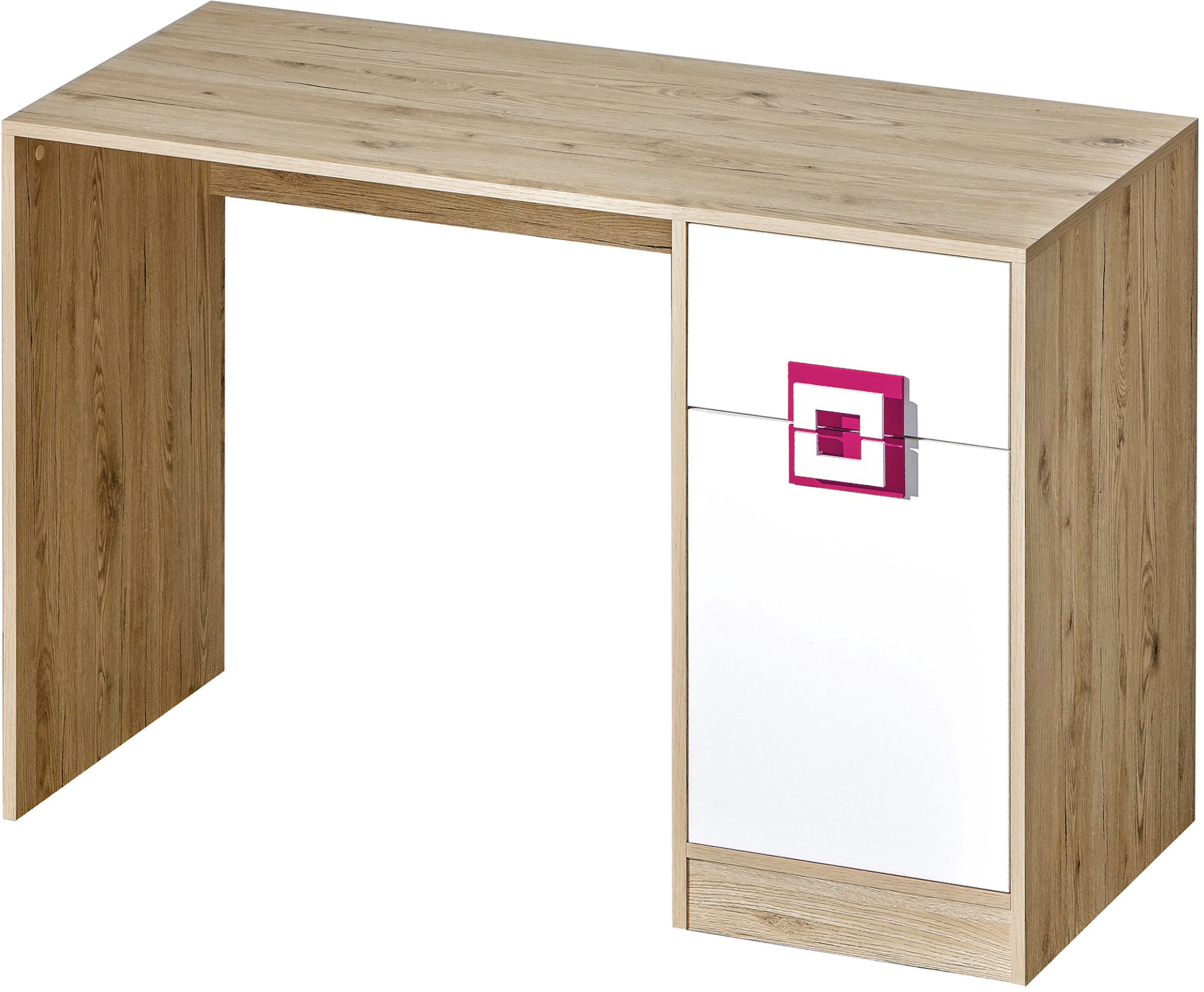 Pisani stol Nico 10 – Domel predstavlja uravnotežen izbor za sve koji cijene jednostavan dizajn, kvalitetne materijale i ugodnu kombinaciju boja. Hrastov drveni dekor u kombinaciji s bijelom i ružičastom bojom stvara svjež i topao ambijent, prikladan za dječju ili omladinsku sobu, ali i za suvremeni kućni ured. Izdržljiva iverna ploča debljine 16 mm osigurava dug vijek trajanja, jednostavno čišćenje i stabilnost. S mjerama 120 × 50 × 78 cm, stol je funkcionalan, prostorno štedljiv i vizualno privlačan izbor koji će se odlično uklopiti u svaki suvremeni interijer.
