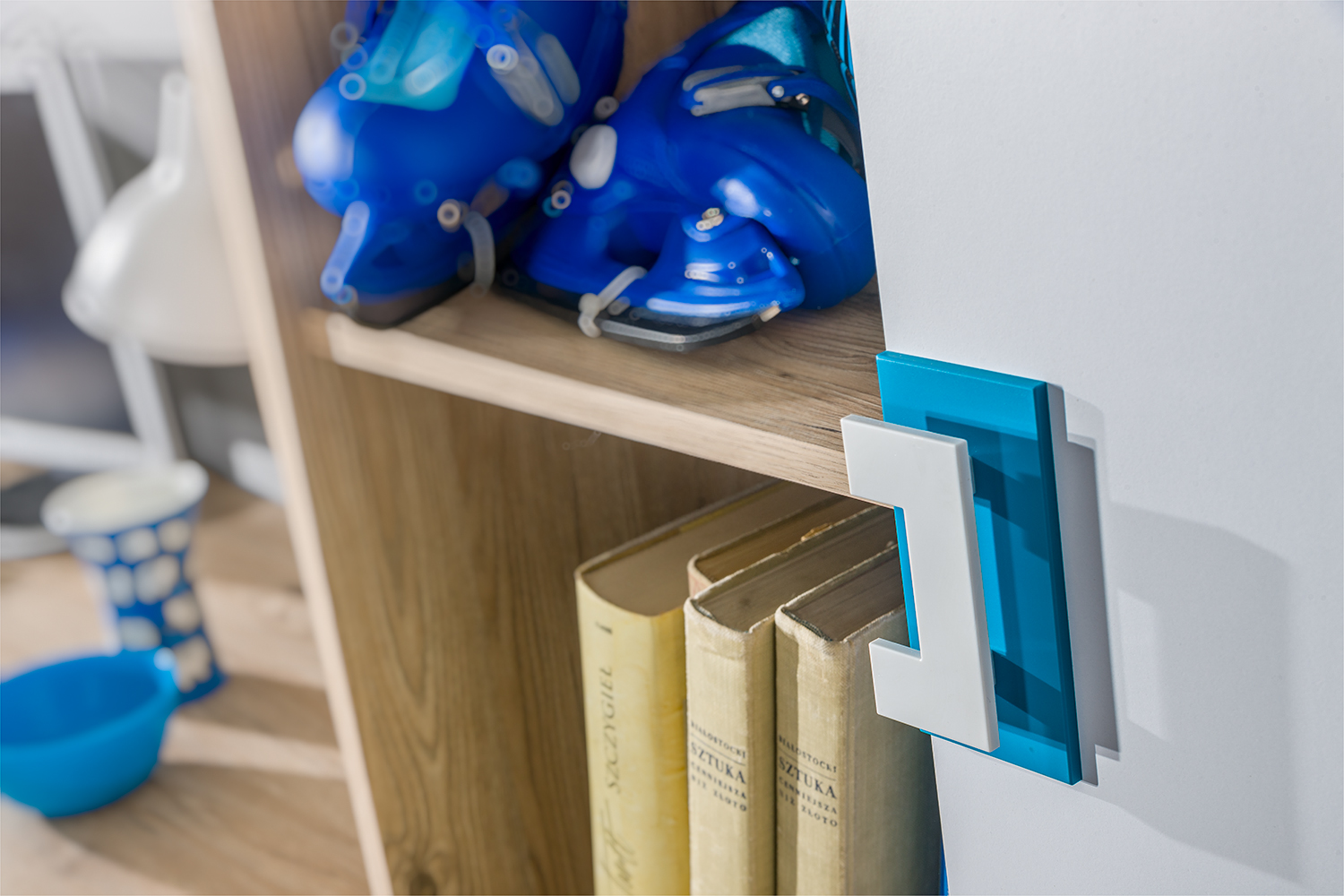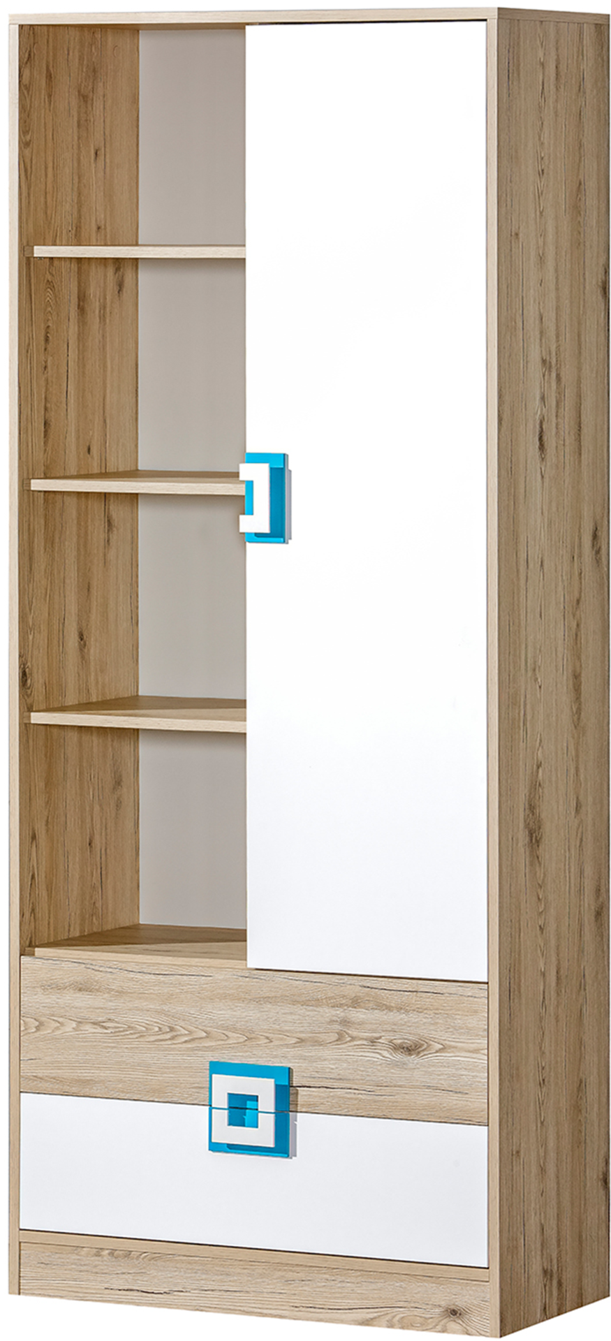 Osnovna boja regala je svijetli hrast, koji unosi toplinu i osjećaj prirodnosti u prostor. Bijela i tirkizna boja ručki stvaraju ugodan kontrast zbog kojeg regal ističe, a da nije nametljiv. Ova kombinacija boja lijepo se uklapa i uz svijetli i uz tamniji namještaj, pa ga je lako uključiti u različite interijere. Tirkizni detalji posebno u sobama za mlade unose energiju i suvremen dojam.