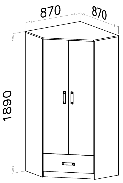 Ormar mjeri 87×87×189 cm, što znači da nudi optimalan omjer prostranosti i kompaktnosti. Kutna konstrukcija omogućuje da se lijepo uklopi u manje prostore, a da pritom ne izgubi na funkcionalnosti. Visina od 189 cm omogućuje učinkovitu organizaciju unutrašnjosti, pri čemu su police i dijelovi za vješanje raspoređeni tako da olakšavaju pristup svim pohranjenim predmetima.