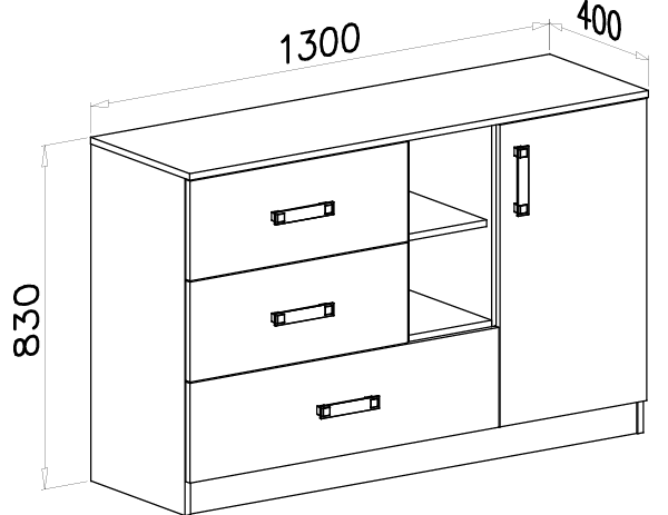 Dimenzije komode iznose 130×40×83 cm, što znači da nudi dovoljno prostora za pohranu, a da pritom ne zauzima previše podne površine. Visina od 83 cm omogućuje praktičnu odlagalnu površinu za dekorativne predmete, svjetiljke ili svakodnevne potrepštine, dok dubina od 40 cm osigurava optimalan raspored unutarnjeg prostora. Takva veličina prikladna je za većinu stambenih prostora jer omogućuje učinkovito korištenje prostora uz zadržavanje prostranog dojma sobe.