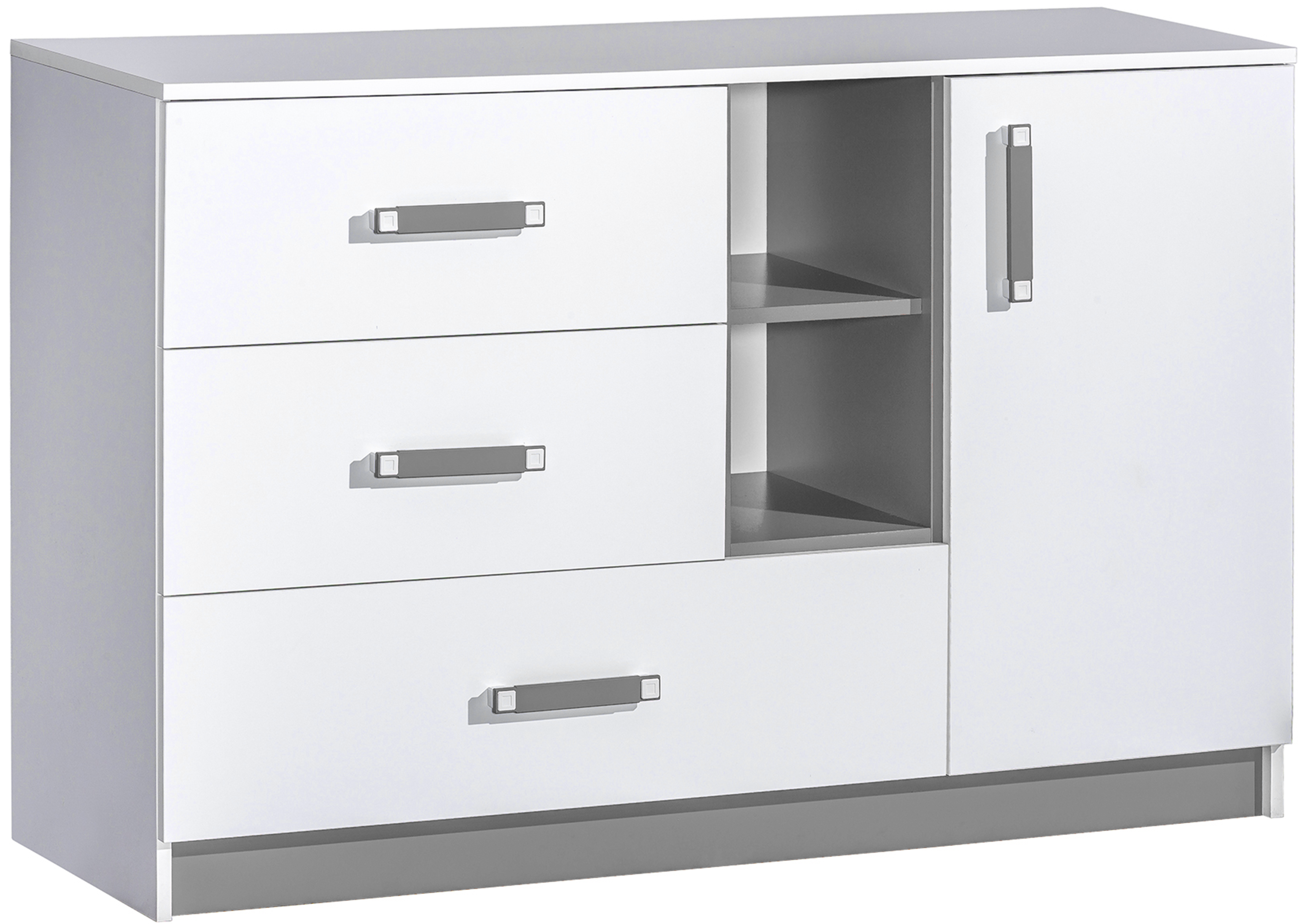 Komoda je izrađena od 16 mm debele laminirane iverice koja osigurava stabilnost i trajnost. Svi rubovi zaštićeni su ABS rubnom trakom debljine 0,5 mm, što povećava otpornost na udarce i vlagu te sprječava krunjenje rubova. Taj detalj, iako diskretan, značajno doprinosi dugotrajnoj estetskoj vrijednosti namještaja. Bijela i siva boja stvaraju elegantan kontrast koji vizualno osvjetljava prostor i omogućuje harmonično usklađivanje s ostalim elementima unutarnjeg uređenja. Sive ručke od sintetičkog materijala dopunjuju čist izgled fronte i omogućuju udoban prihvat pri otvaranju ladica ili vratnica.