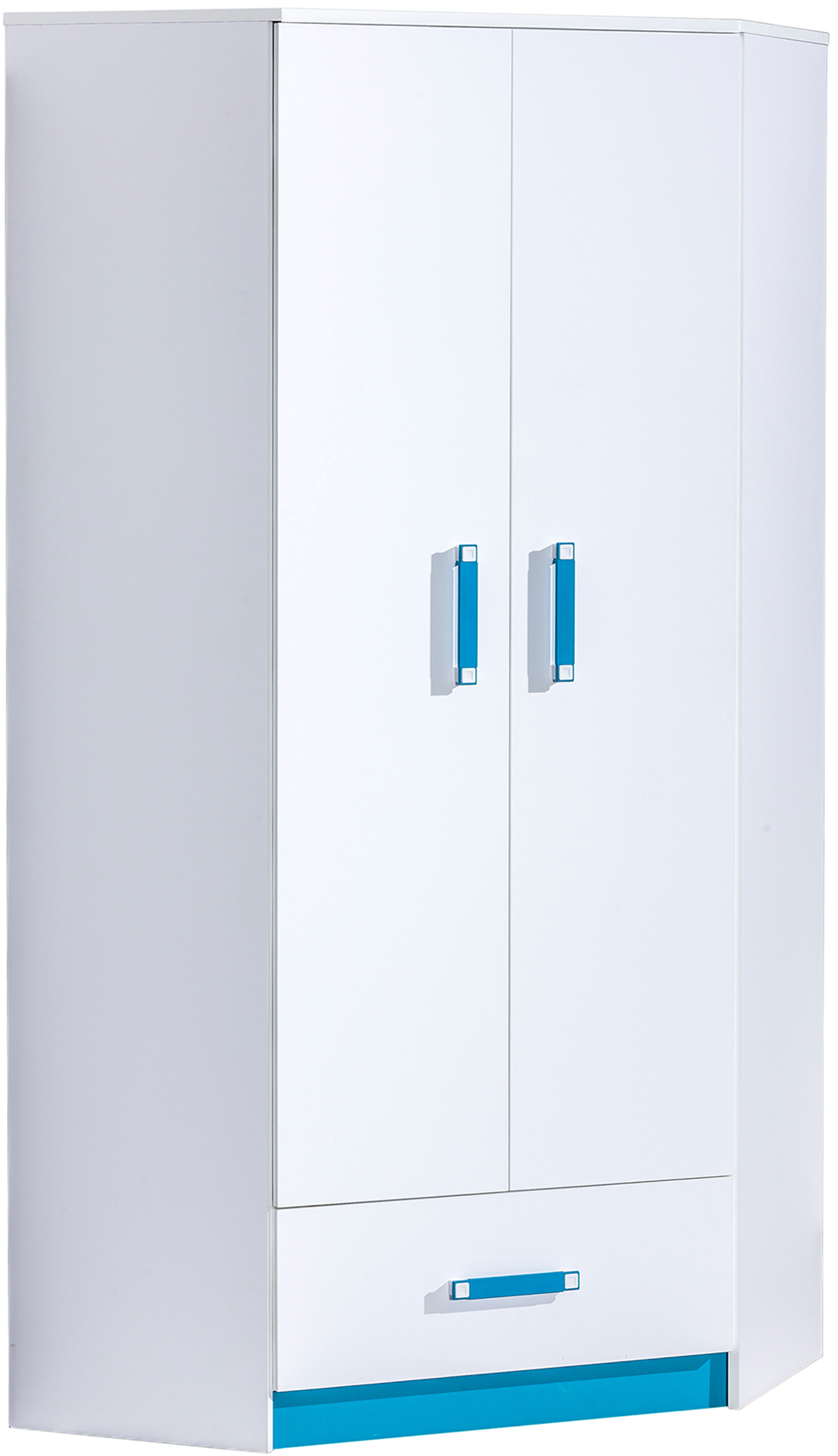 Ormar Trafiko 2 ističe se svojom nježnom kombinacijom bijele i tirkizne boje. Bijela boja pruža osjećaj prostranosti i čistoće, dok tirkizne ručke dodaju razigran i mladenački dodir. Takav dizajn boja lijepo se uklapa u različite interijere, osobito u suvremene, minimalističke i omladinske sobe. Kutni oblik omogućuje da se ormar savršeno uklopi u kut prostorije, a da je pritom optički ne smanji, što je idealno za manje prostore ili one koji žele maksimalnu funkcionalnost u ograničenom tlocrtu.