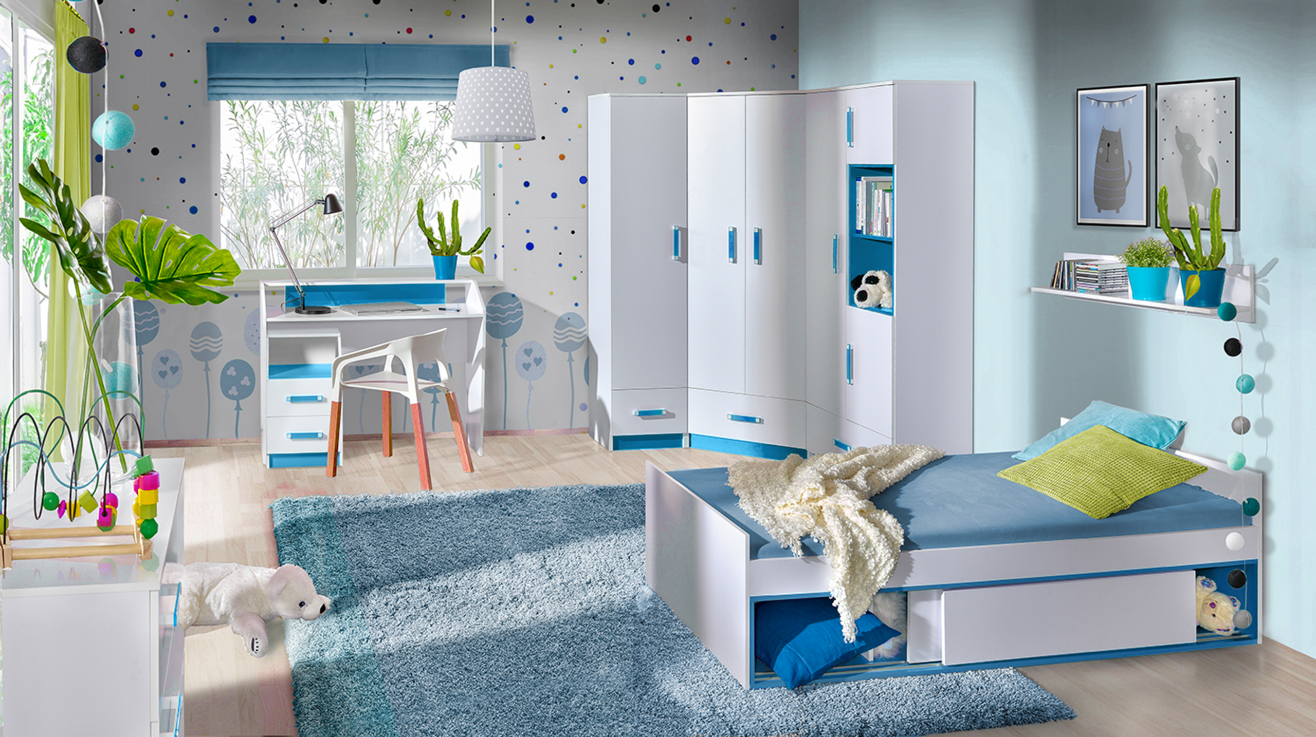 Bijela osnovna boja stvara osjećaj prostranosti i čistoće, dok tirkizni naglasci unose energiju i svježinu u prostor. Takva kombinacija lijepo se slaže s različitim stilovima namještaja – od suvremenog do skandinavskog – te omogućuje jednostavno usklađivanje s dodacima poput stolica, polica ili tekstila u sličnim tonovima.