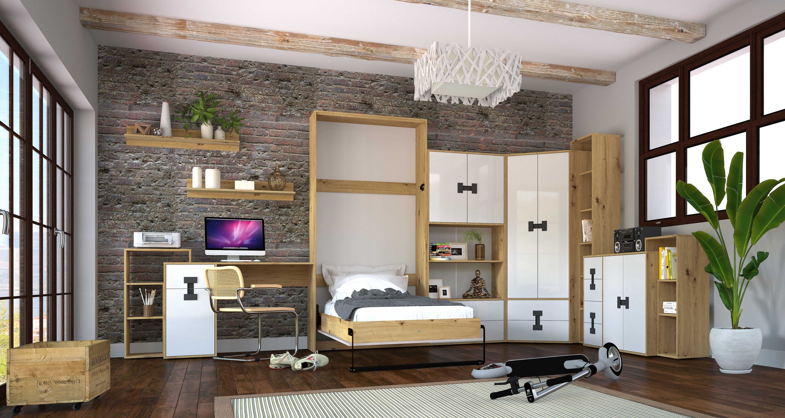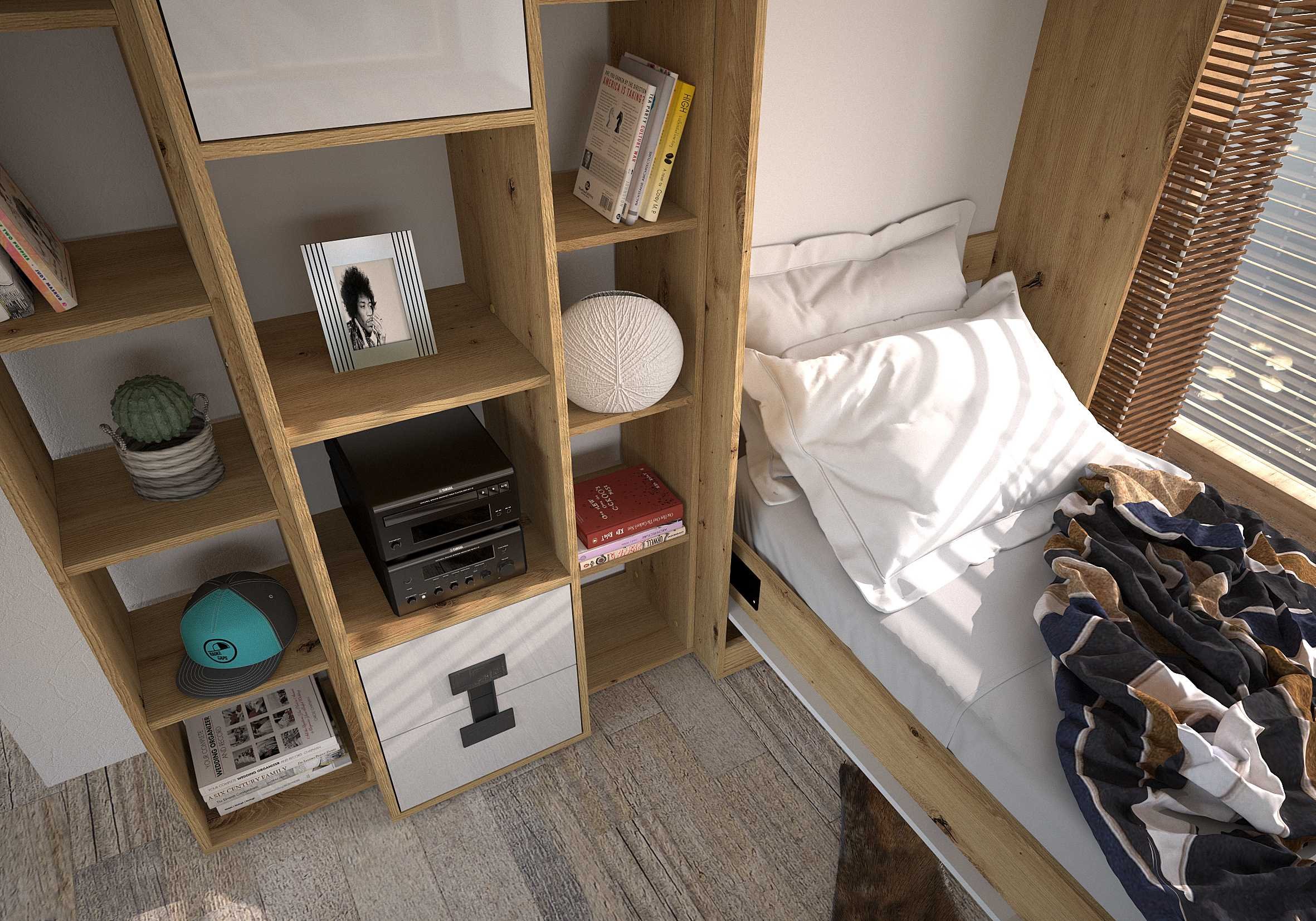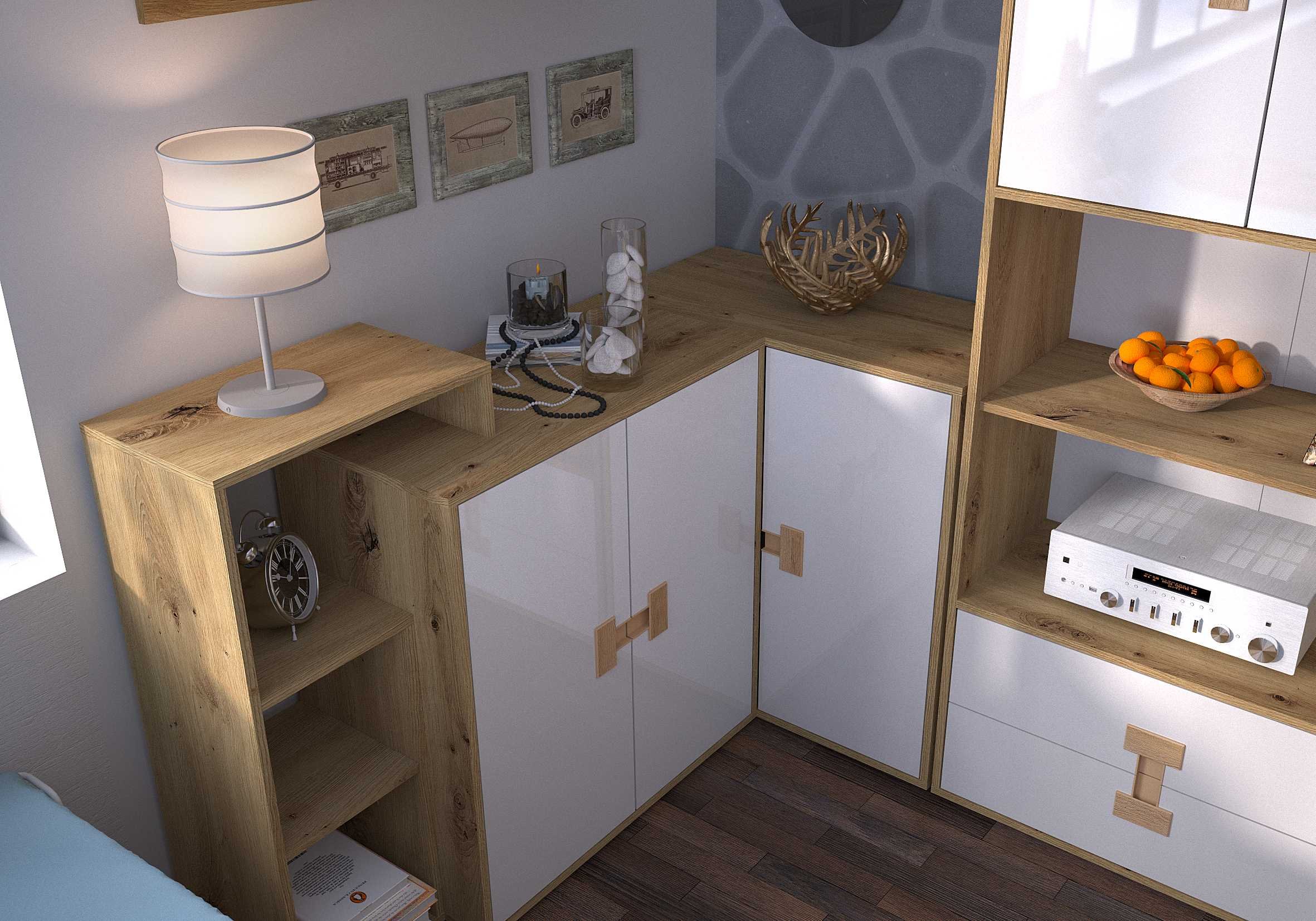 Linija Index osmišljena je s mišlju na prilagodljivost i maksimalno iskorištavanje prostora. Geometrijski, pravilni oblici omogućuju jednostavno sastavljanje pojedinih modula – od klasičnih ormara do kompaktnih radnih stolova i praktičnih regala. Zbog toga je moguće stvoriti potpuno individualan raspored sobe, koja raste zajedno s djetetom. Drveni dekor artisan hrasta daje toplinu, dok sjajne bijele fronte vizualno povećavaju prostor i unose osjećaj svježine.