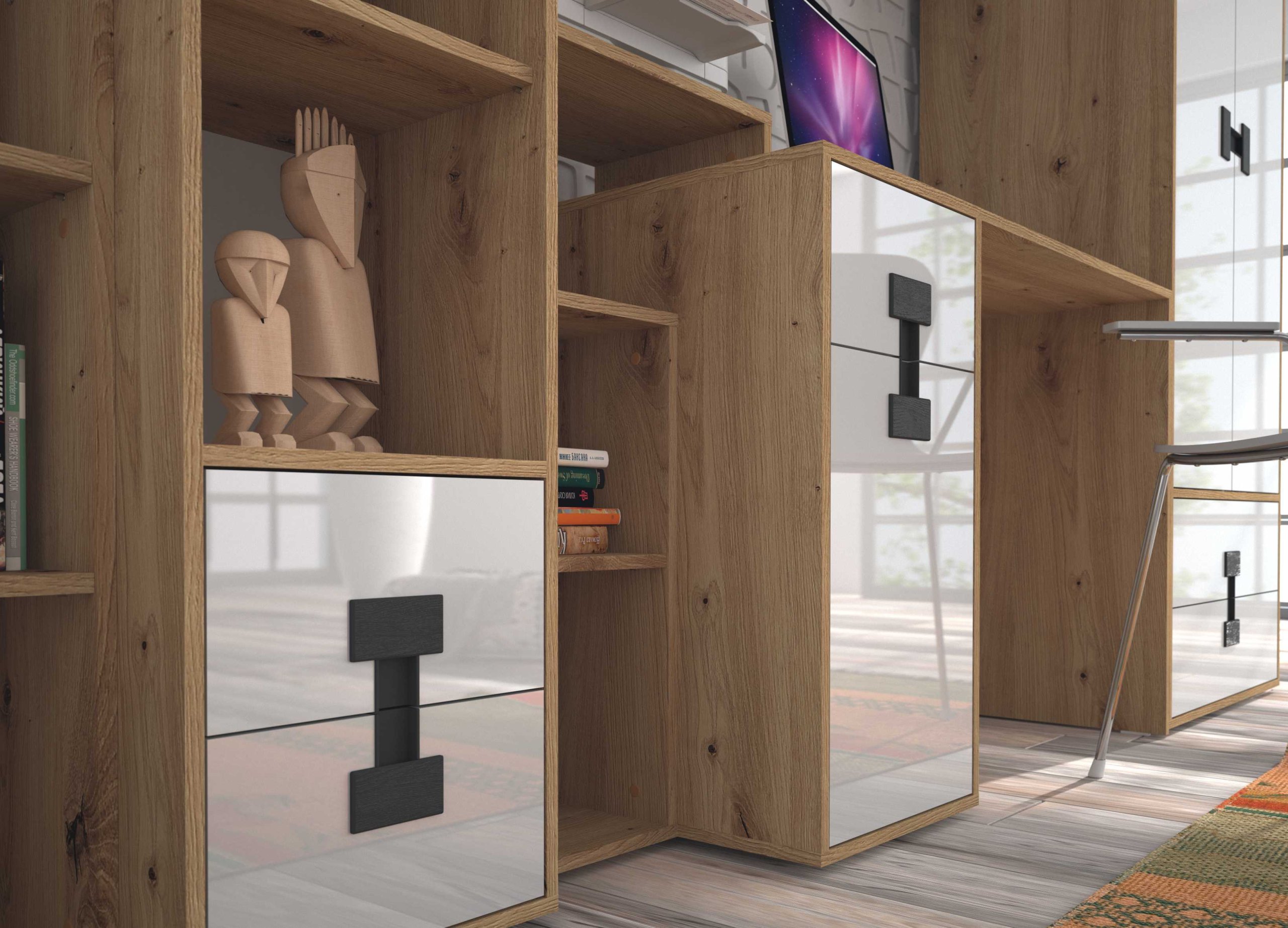 Kolekciju nadopunjuju ručke u četiri boje – bijeloj, crnoj, hrastovoj i sivoj. Ovaj izbor omogućuje suptilnu personalizaciju izgleda te naglašava kontraste između pojedinih površina. Svi elementi osmišljeni su tako da nude dovoljno prostora za pohranu i organizaciju, što pridonosi urednosti dječje sobe.