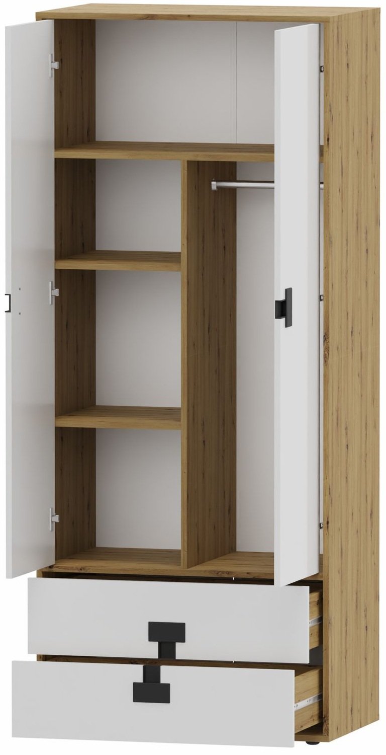 Garderobni ormar Index 01 robne marke Domel dizajniran je za one koji cijene suvremenu estetiku i funkcionalni raspored prostora. Kombinacija površina u bijelom sjaju i toplom tonu artisan hrasta stvara ugodan kontrast koji se lijepo uklapa s različitim stilovima unutarnjeg uređenja – od minimalističkih do klasičnijih ambijenata. Dizajniran je od kvalitetne iverne laminirane ploče debljine 16 mm, što osigurava stabilnost i dug vijek trajanja, a istovremeno omogućuje jednostavno čišćenje i održavanje.