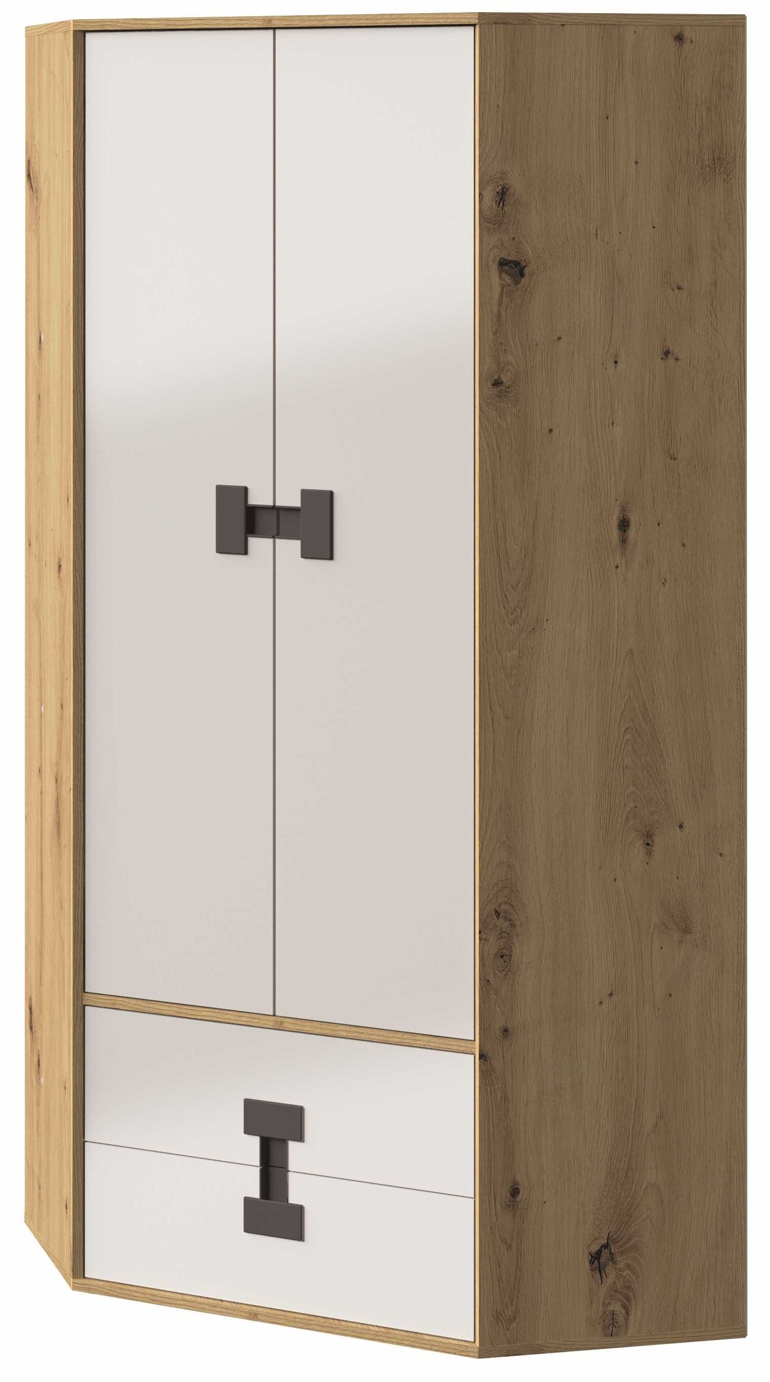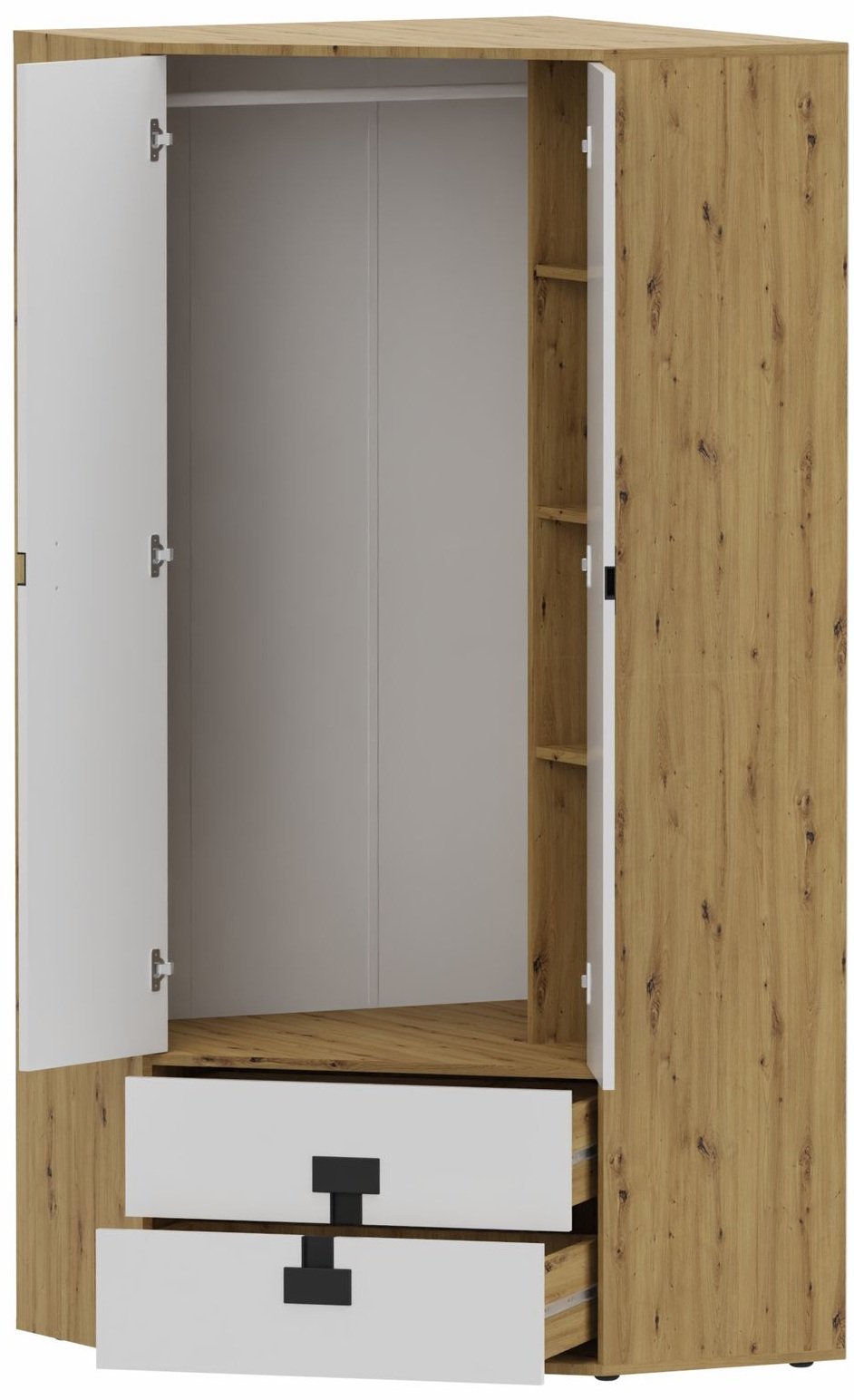 Kutni garderobni ormar Index 02 – Domel spaja funkcionalnost, estetiku i kvalitetnu izradu. Kombinacijom bijele sjajne površine i artisan hrasta unosi u prostor suvremenu eleganciju i toplinu prirodnog drva. Njegov dizajn omogućuje učinkovito korištenje prostora, što je osobito važno u manjim stanovima ili sobama. Izrađen u Poljskoj od kvalitetnih materijala, predstavlja pouzdan izbor za svaki dom gdje su red i lijep izgled jednako važni.