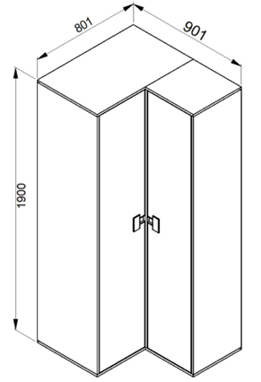 Dimenzije ormara iznose 80,1×90,1×190 cm. Takav dizajn omogućuje optimalan raspored unutarnjeg prostora, a ormar pritom ne djeluje preveliko ili glomazno. Kutna postava omogućuje da ga smjestite u neiskorišteni kut prostora, što povećava iskoristivost sobe. Zbog svoje visine nudi dovoljno prostora za vješanje odjeće i odlaganje dodatnih predmeta na police.