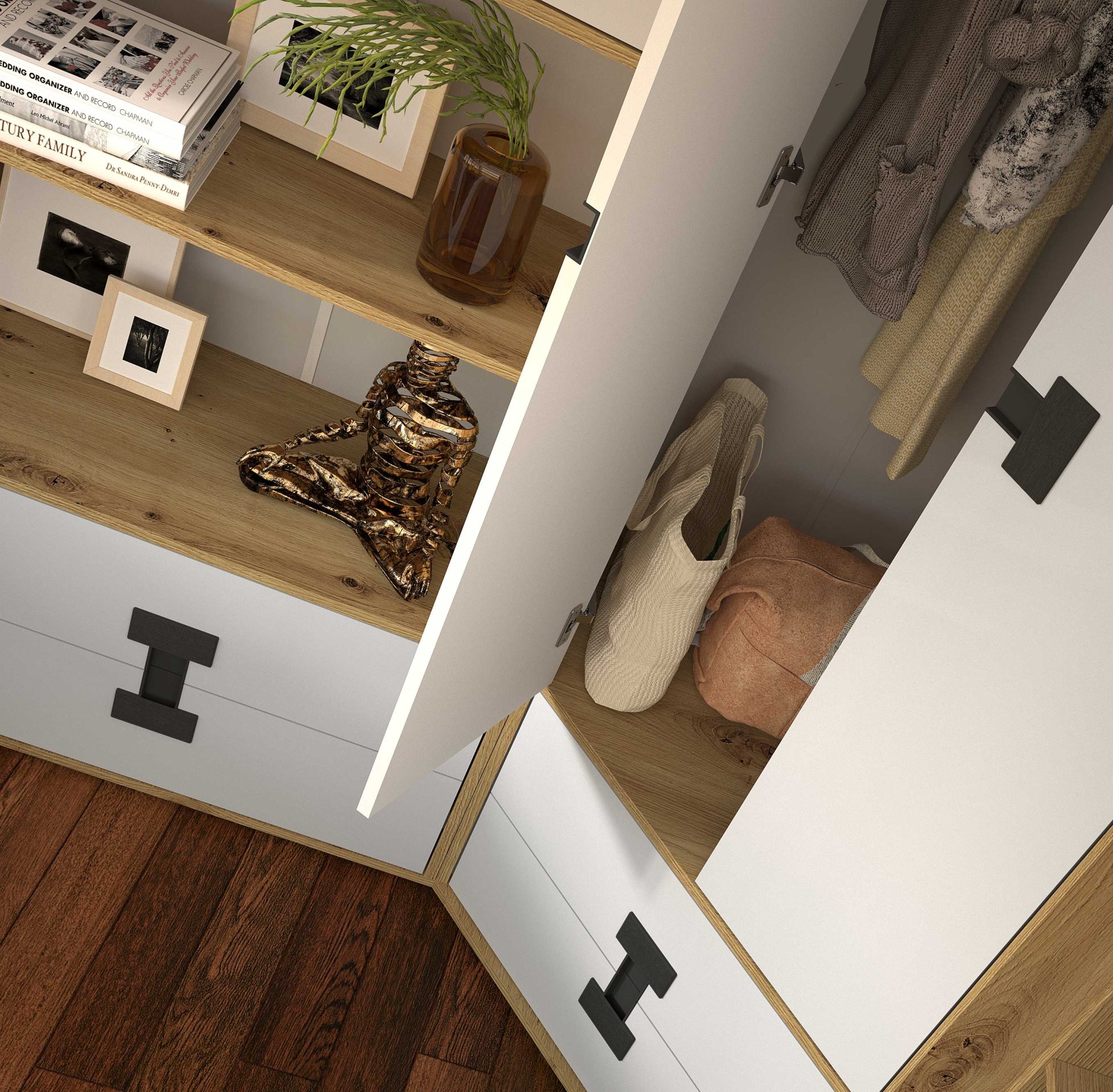 Kombinacija boja bijeli sjaj/artisan hrast donosi zanimljiv kontrast između sjajne i matirane površine. Bijeli sjaj dodaje prostoru svježinu i svjetlost, a artisan hrast toplinu i prirodnu teksturu drva. Ova kombinacija lijepo se uklapa u suvremene interijere, a istovremeno ostaje dovoljno neutralna da se može nadopunjavati različitim bojama i naglascima.
