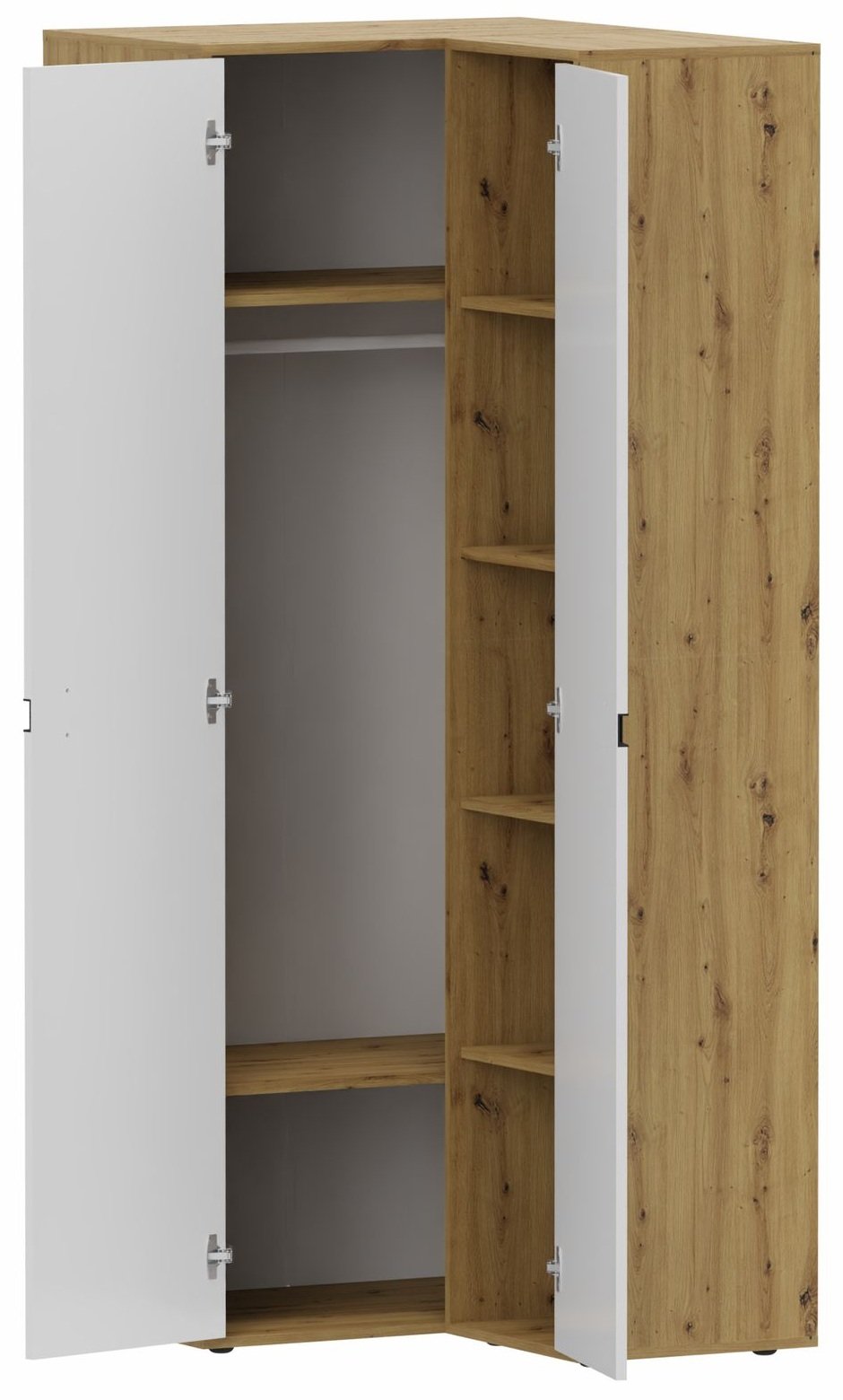 Kutni garderobni ormar Index 03 marke Domel spaja moderan izgled, praktičan dizajn i kvalitetnu izradu. Dizajniran je za optimalno iskorištavanje prostora u spavaćoj sobi, predsoblju ili garderobi, jer njegov kutni tlocrt omogućuje učinkovito pohranjivanje i u manjim prostorima. Kombinacija boja bijeli sjaj i artisan hrast stvara vizualnu ravnotežu između svijetlog, modernog izgleda i topline prirodnog drva.