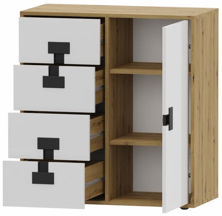 Komoda je dizajnirana tako da se prilagođava različitim stilovima unutarnjeg uređenja. U minimalističkom interijeru naglašava svjetlinu i čiste linije, dok se u rustikalnom okruženju odlično slaže s drvenim detaljima. Bijela sjajna površina naglašava svježinu prostora, dok tekstura artisan hrasta unosi osjećaj topline i prirodne elegancije. Takva kombinacija idealna je za sve koji žele stvoriti ugodan, harmoničan i suvremen životni prostor.
