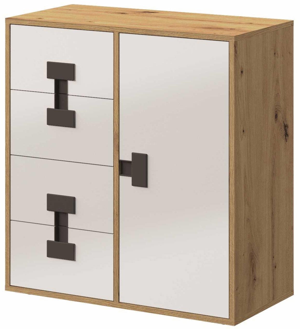 Komoda Index 07 je moderan komad namještaja koji sa svojim jednostavnim, ali profinjenim oblikom spaja funkcionalnost i estetsku savršenost. S dimenzijama 80,1×40×84,7 cm odlično se prilagođava različitim prostorima – od dnevnog boravka, spavaće sobe do predsoblja. Izrađena je od kvalitetne iverice laminirane ploče debljine 16 mm, što osigurava stabilnost i dug vijek trajanja. Površina u boji kombinacije bijeli sjaj i artisan hrast unosi u prostor svjetlost te ugodnu toplinu prirodnih tonova.