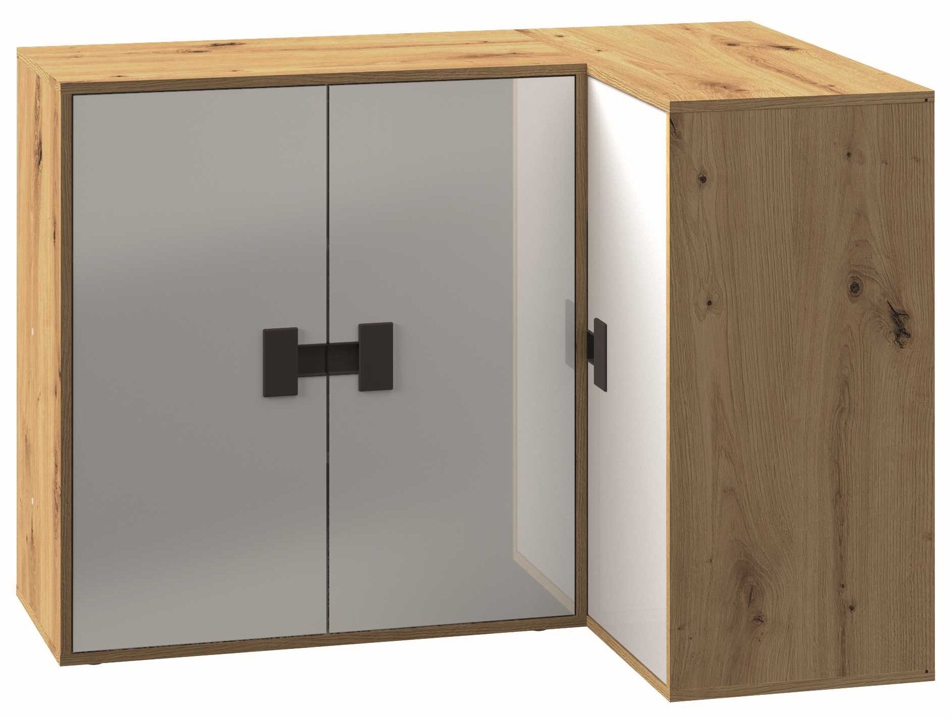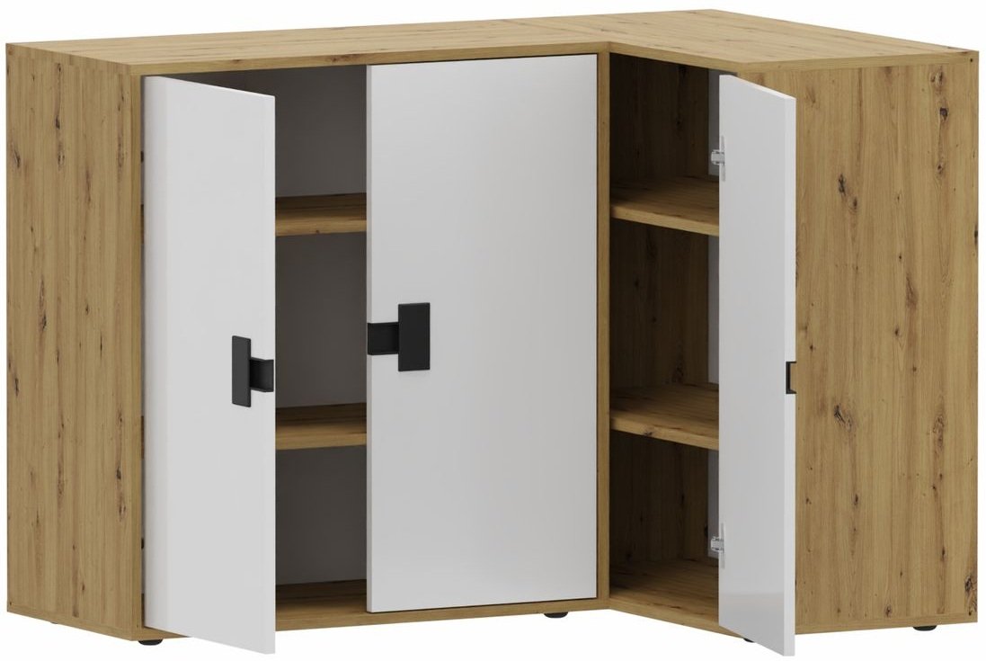 Kutna komoda Index 09 idealno je rješenje za svaki prostor gdje želite spojiti funkcionalnost i moderan izgled. Njezin promišljeni oblik omogućuje optimalno iskorištenje kuta, a istovremeno održava estetsku ravnotežu između svijetlog sjaja i prirodne topline drvenog dekora. Komoda je izrađena od kvalitetne iverice laminirane ploče debljine 16 mm, što osigurava čvrstoću i dug vijek trajanja. Površina je jednostavna za čišćenje i otporna na habanje, pa ostaje privlačna i nakon više godina uporabe.