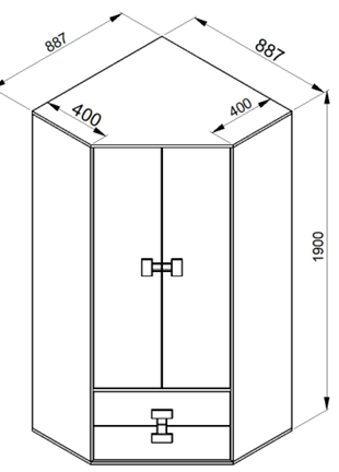 Dimenzije ormara 88,7×88,7×190 cm omogućuju da se savršeno prilagodi kutu prostorije, a istovremeno nudi iznenađujuće mnogo prostora za pohranu. Kutna postava posebno je pogodna za manje prostore, gdje je svaki kvadratni metar dragocjen. Svojim oblikom ormar učinkovito popunjava inače neiskorišten kut i tako omogućuje pregledno i uredno spremanje odjeće, obuće ili drugih osobnih predmeta.