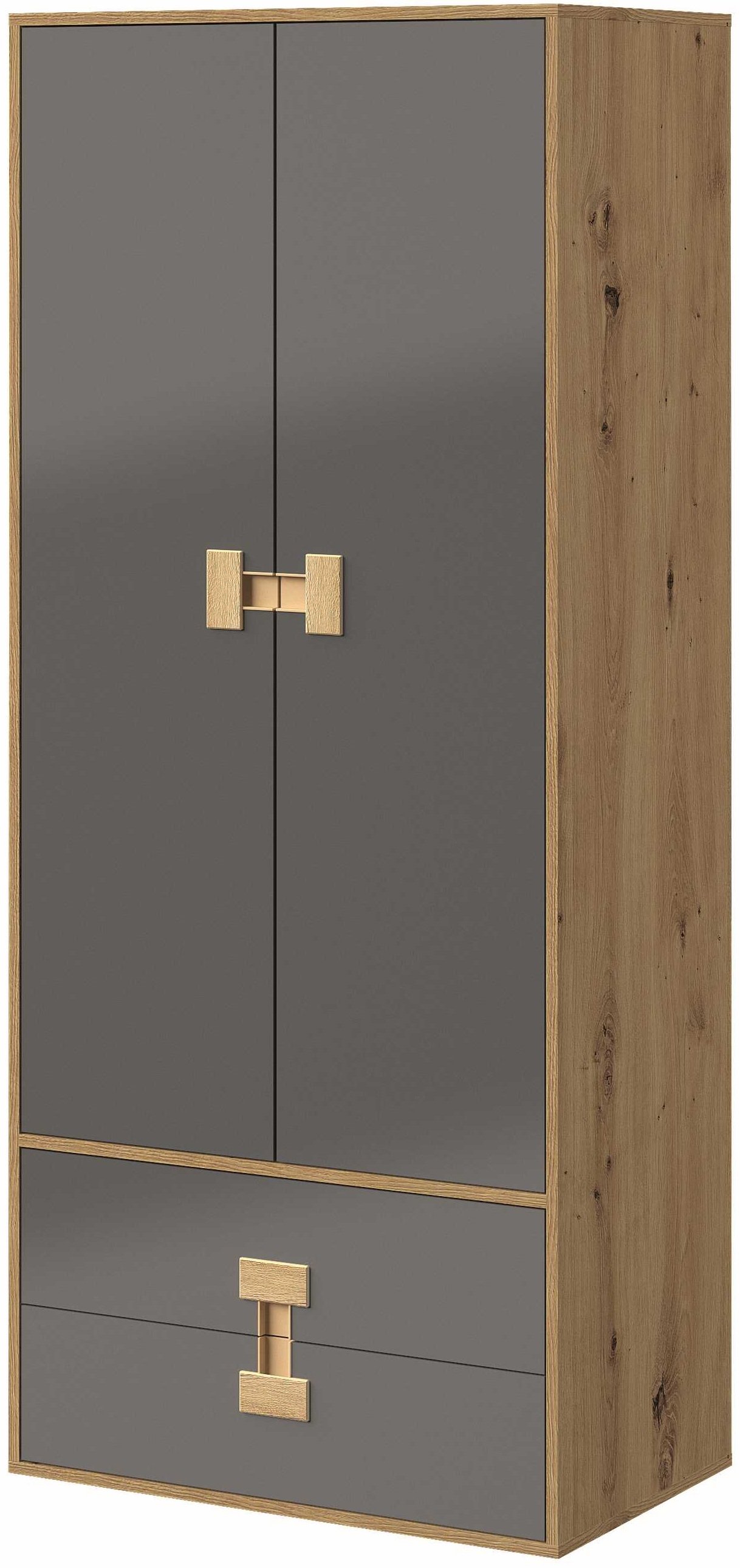 Izrazita kombinacija boja siva sjaj/artisan hrast sjaj osigurava uravnotežen kontrast između modernog i prirodnog. Siva sjajna površina djeluje elegantno i minimalistički, dok toplina hrasta dodaje osjećaj domaće ugode. Ormar je opremljen ručkama u različitim izvedbama – bijelim, crnim, sivim ili hrastovim – što omogućuje da se izgled prilagodi ostatku namještaja u prostoru.
